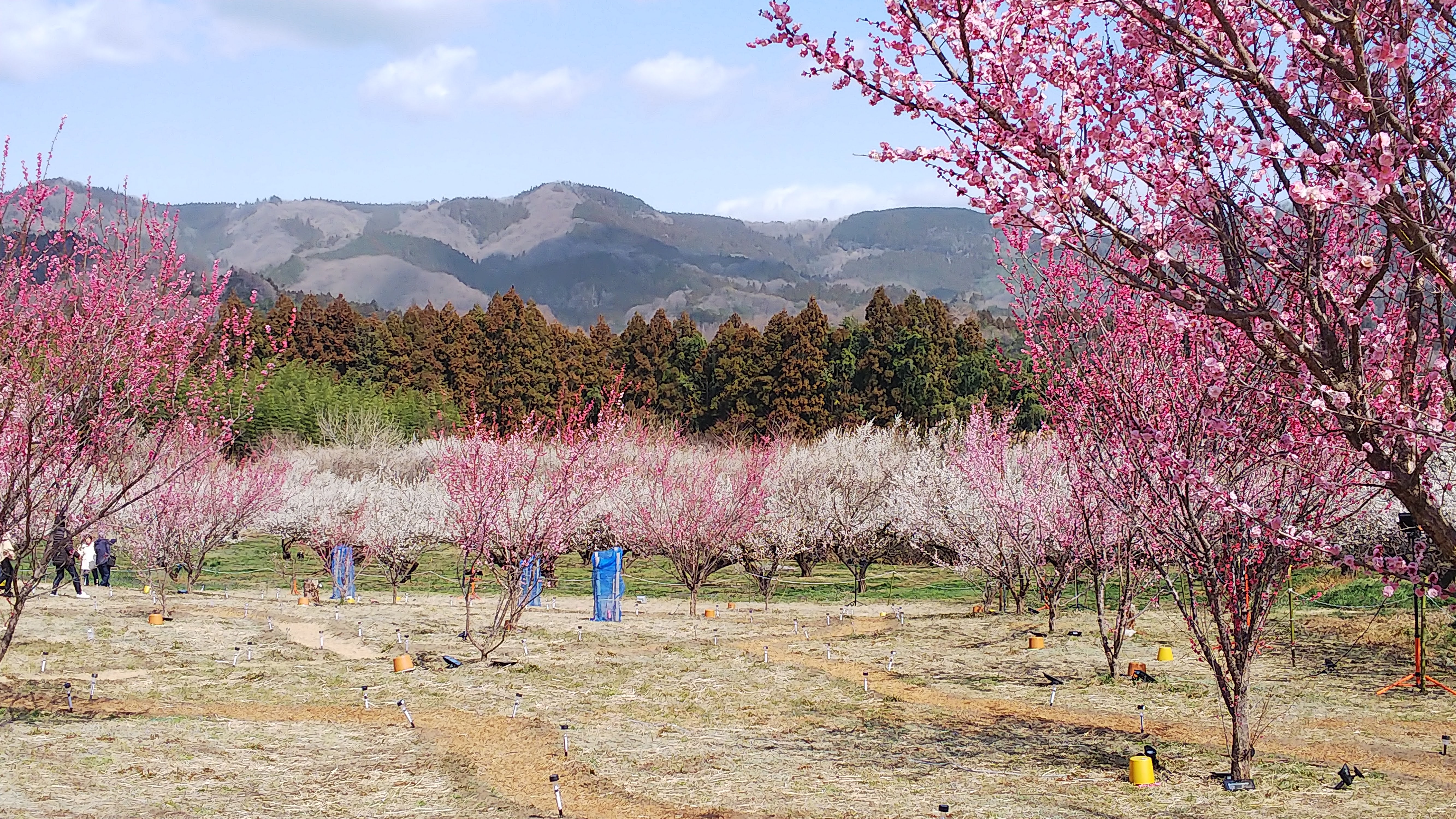 Hillside with thousands of plum trees whose red & white blooms are the focus of an autumn festival.
