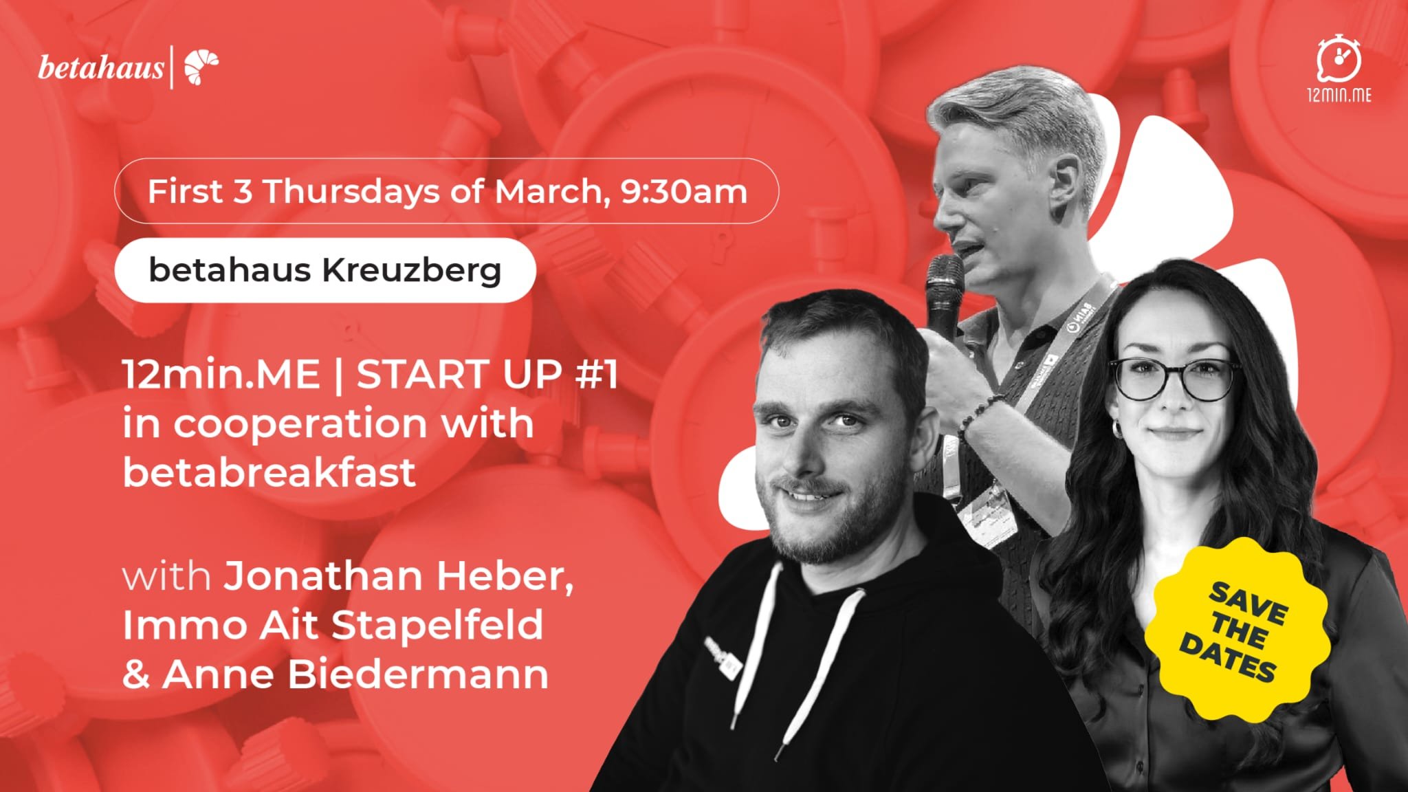 ** ATTENTION: we moved to luma. please RVSP [HERE](https://luma.com/12min.me_Berlin)** # ​[12min.me](https://12min.me/) START UP is a brand new morning format for bold ideas and fresh perspectives ​Berlin Startup Community, we’re launching something new. Together with betahaus, we’re bringing the [12min.me](http://12min.me/) spirit into the morning. ​[12min.me](http://12min.me/) STARTUP is a three-part breakfast series, embedded in the well-known betabreakfast format. Instead of three speakers in one evening, we do things differently. ​One morning. One speaker. One focused impulse. ​12 minutes. One voice. Zero fluff. ​Join us for the first edition of [12min.me](http://12min.me/) STARTUP, a compact morning session for founders, operators, creatives and everyone building things that matter. ​**✔️ What to expect** * ​One inspiring startup-related talk * ​12 minutes of sharp insight * ​Curated exchange over breakfast * ​The familiar [12min.me](http://12min.me/) energy, just earlier in the day# ​ **The formula stays the same** * ​12 minutes talk * ​12 minutes of Q&A * ​12 minutes of networking ​The familiar [12min.me](http://12min.me/) energy, just earlier in the day ​** Our speakers** **Speaker 1 @March 5** **[Jonathan Hegel](https://www.linkedin.com/in/jonathan-beisiegel) from [FW Systems](https://www.linkedin.com/company/frachtwerk/)** Jonathan is the CEO of FW Systems, a specialized system house for open source solutions and IT services with a fixed-price model. After years in traditional IT, where he regularly had to work night shifts due to emergencies, he decided to do things better—for customers and for IT professionals. Today, he help SMEs transform their IT from a constant work in progress to a reliable infrastructure they can depend on. **Jonathan\`s talk: "How we are completely rethinking system administration as a service for your company"** Companies cannot possibly do everything themselves. So things like accounting, logistics, and IT are outsourced to external service providers. In the IT sector, system houses have been doing very well for themselves in recent decades! Every little thing is charged for, and if there are any errors, the customer is expected to open a ticket. We are rethinking this! We are applying the “as-a-service” concept from Airbnb, Uber, and Everstox to system administration and taking responsibility. Jonathan will show how this works in his talk. ​ **Speaker 2 @March 12** **[Anne Biedermann](https://www.linkedin.com/in/anne-biedermann/), independent wealth partner for women** Anne has extensive experience across venture capital, single-family-office & HNWI investing, and early-stage operations. She works with investors who are building, inheriting, or stewarding wealth on how to allocate capital with clarity — particularly where venture capital intersects with long-term wealth strategy. Anne also invests personally, giving her a practitioner’s perspective on capital allocation decisions. **Anna\`s talk: "Not All Capital Is the Same: Decoding Investor Behavior"** Founders often assume all investors evaluate risk, timelines, and returns the same way and that assumption is costly. This session breaks down how funds, family offices, and individual investors actually make decisions, where founder–investor misalignment typically begins, and how founders can better position themselves for the right kind of capital, not just any capital. **Speaker 3 @March 19** **[Immo Ait Stapelfeld](https://www.linkedin.com/in/immoaitstapelfeld/), Co-Founder & CEO at [913.ai](https://913.ai)** **"From Legal Complexity to Practical AI. How We Help Regulated Industries Use AI Without Losing Control"** This presentation tells the story of Immo’s transition from a trained lawyer working in mass proceedings to an entrepreneur building AI products for regulated industries. His legal background, combined with hands-on experience as a founder, shaped a pragmatic view on AI. not as a disruptive replacement, but as a controlled and compliant tool. At[ ](http://913.ai)[913.ai](https://913.ai), this perspective enables conservative organizations such as insurers to enter the AI era in a way that respects regulation, responsibility, and existing teams while still unlocking real efficiency gains. ​ **The series at a glance** [12min.me](http://12min.me/) STARTUP consists of three independent sessions. Please follow the luma link for registration: * ​[March 5, 2025](https://luma.com/yo32qaud) * ​[March 12, 2025](https://luma.com/y0wytmck) * ​[March 19, 2025](https://luma.com/cucrx8is) ​Each session has its own Luma page and can be attended individually. ​**Event details for the whole series** * ​**Location**: betahaus Kreuzberg, Rudi-Dutschke-Straße 23, 10969 Berlin * ​**Time**: Doors open 9:30, Start 10:00, End 11:00 * ​**Entry**: Free entry including breakfast and drinks * ​**RSVP:** via [Lu.ma](http://lu.ma/) to save your spot as spots are limited ​**Why mornings** Because good ideas don’t only happen after work. We believe in strong insights, respectful use of time and real conversations, even before noon. ​​ Join our WhatsApp group for more details and to engage with the community - [HERE](https://chat.whatsapp.com/FWphInbgYaKJUGv7Uusum9) we go. ​We’re looking forward to kicking off this new format with you. Lots of love, Your [12min.me](http://12min.me) Berlin crew [Sandra](http://linkedin.com/in/sandrakarner), Olha, Silvana, Ben \*\*\* **Media rights (picture and video recordings):** Participants agree that photos and video recordings made during the event may be used without any claim to compensation and without any time or space restrictions. The rights to image and video material are transferred to the organiser or the representatives of the press or other parties distributing image and sound material who are present on site, without exception and without any time or place restrictions.