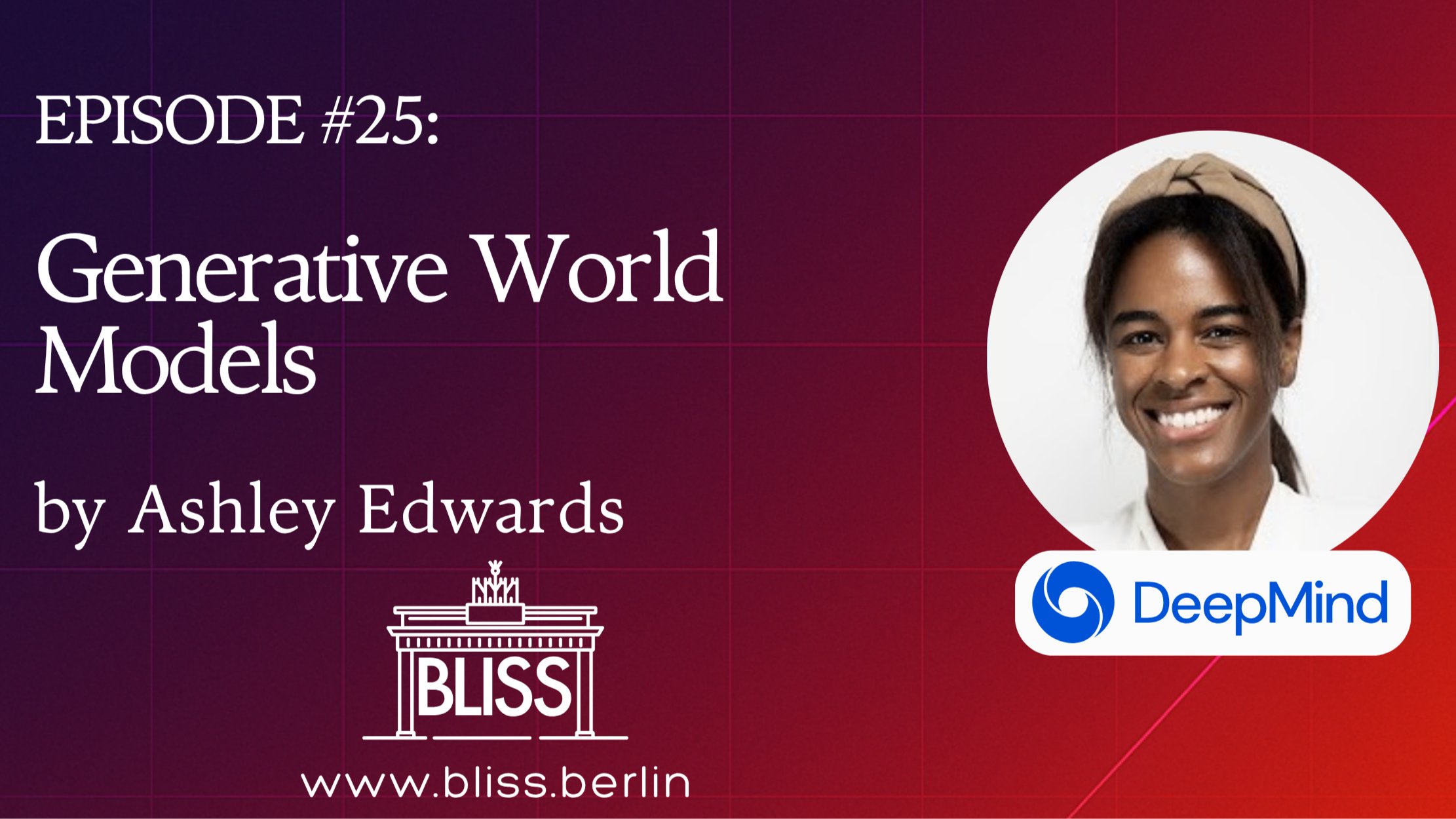 We are excited to feature **Ashley Edwards**, who is currently a Senior Research Scientist at **Google DeepMind** and will discuss "**Generative World Models**", lasting approximately 45 minutes. After the talk, seize the opportunity to connect with fellow AI enthusiasts to share ideas and questions while enjoying free drinks and pizza. **Door close by 7.15pm, so please come early! Also, "attend"ing (RSVP) here on Meetup is strictly necessary to be guaranteed entry.** Please note that Meetup has recently been quite keen on promoting its Plus program. However, you are not obligated to purchase it, as both our events and the platform remain free. **Who is this event for?** This event is open to everyone interested in state-of-the-art AI research. We especially design it for students, PhD candidates, academic researchers, and industry professionals with a research focus in machine learning. **Abstract**: Training models on large-scale data has given us powerful generative capabilities for text, images, and video. However, this success has not yet extended to training generalist embodied agents. This talk tackles this gap by focusing on a potential solution to this problem: scalable world models. We'll trace the idea of planning in predictive models, from its origins to modern efforts on building world models directly from pixels. I'll discuss the primary challenge of scaling these models and present our work, Genie, which enables us to learn world models without explicit action labels at scale, demonstrating a new path forward for training the generalist agents of the future. **Bio**: [Ashley](https://ashedwards.github.io/) is a Senior Research Scientist at Google DeepMind, where she works on reinforcement learning and foundational world models. She received her PhD in Computer Science from Georgia Tech in 2019, where she developed models for inferring latent actions, rewards, and policies from videos. Previously, she was a Research Scientist at Uber AI Labs and an intern at Google Brain. She holds a BSc in Computer Science from the University of Georgia. We are [BLISS](https://bliss.berlin/) e.V., the **AI** **organization** in Berlin that **connects like-minded individuals** who share great interest and passion for the field of machine learning. This winter 2025/26, we will, again, host an exciting speaker series on site in Berlin, featuring excellent researchers from Tübingen AI Center, DeepMind, Microsoft, King's College London, cohere, and ETH Zürich. Website: [https://bliss.berlin](https://bliss.berlin/) Youtube: [https://www.youtube.com/@bliss.ev.berlin](https://www.youtube.com/@bliss.ev.berlin) Disclaimer: By attending this event you agree to be photographed.