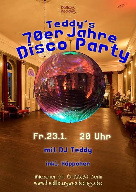 Tonight, dance the night away to the biggest 70s disco hits at the ballroom until the dance floor shakes! They're inviting you to enjoy some snacks and are looking forward to great dance music spun by DJ Teddy. Spread the word!