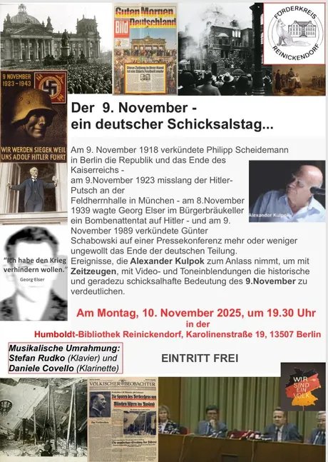 On 9 November 1918, Philipp Scheidemann proclaimed the republic and the end of the German Empire in Berlin. On 9 November 1923, Hitler's coup attempt at the Feldherrnhalle in Munich failed. ; on 8 November 1939, Georg Elser attempted to assassinate Hitler with a bomb in the Bürgerbräukeller; and on 9 November 1989, Günter Schabowski more or less unintentionally announced the end of German division at a press conference.