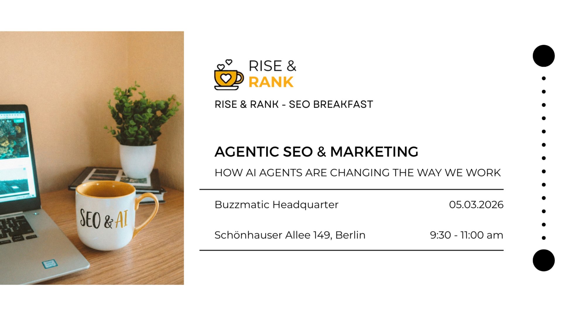 **How AI Agents Are Changing the Way We Work** Join us on March 5th, for an exciting session, which will aim to help you develop your skills in the world of SEO, GEO, AI and Marketing. The session will be held at the **Buzzmatic Office, Schönhauser Allee 149**, from **9:30 to 11:00**. Enjoy **free attendance,** some lovely **breakfast** and great conversation! The returning champion of our breakfast events, our CEO Raoul Schreck, will give us the full rundown on how AI Agents are changing the way we work. 2026 is the year AI agents are going from buzzword to daily workflow. Claude Code, Claude Cowork, n8n and recently OpenClaw are the tools of the hour. But what does that actually mean for SEO and marketing teams? This session cuts through the hype and shows what's real: live demos and practical workflows using Claude Code, Claude Skills, Agents and the Model Context Protocol (MCP). You'll see how autonomous agents plan, decide, and execute multi-step marketing tasks – from content production to AI visibility audits to automated reporting. **No slides, just tools, workflows, and some stuff that will blow your mind.** This session is ideal for SEOs, marketeers and anyone looking to expand their understanding of how AI is increasingly influencing these fields. In the following months we will also be hosting external speakers Nicolas Caramella and Andrés Tapia for some deepdives on related topics. We will be posting more about these events soon, so stay tuned! You can also find our events on Eventbrite: https://www.eventbrite.com/e/agentic-seo-marketing-tickets-1983261319996 Bring yourself, a good mood and any thoughts or questions you have on the subject. We look forward to seeing you there and hearing your thoughts!