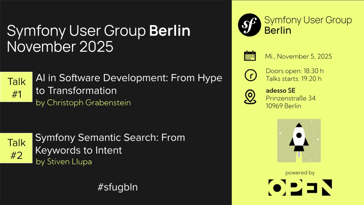 Hello fellow Symfonians, we are thrilled to announce the next user group meeting of the year, featuring two insightful talks that you **won't want to miss**! This time we are hosted by adesso SE (Prinzenstraße 34 10969 Berlin). Come by and enjoy an evening of learning, networking, and socializing with fellow Symfony and PHP developers. **Agenda:** 18:30: Doors open 19:00: Welcome and Introduction 19:20: **Talk 1: "AI in Software Development: From Hype to Transformation" by Christoph Grabenstein** 19:50: Break & Snack 20:00: **Talk 2: "Symfony Semantic Search: From Keywords to Intent" by Stiven Llupa** 20:40: Socializing **Talk Details:** **Talk 1: "AI in Software Development: From Hype to Transformation" by Christoph Grabenstein** AI is quickly reshaping the way we build software—and the way we see ourselves as developers. What once felt like a distant curiosity is now part of our daily work, bringing both excitement and unease. This talk reflects on that shift: how the introduction of AI touches not just our tools and workflows, but also our sense of purpose, identity, and connection within the craft. By looking at how people and organizations respond to moments of change, we can begin to understand what this transformation might really mean for us. **Talk 2: "Symfony Semantic Search: From Keywords to Intent" by Stiven Llupa** Add semantic search to Symfony using RAG and open-source LLMs. Lessons learned from an automotive PoC, architecture, pitfalls, and moving beyond keywords to intent. Don't miss these insightful talks, engaging discussions, and networking opportunities. We can't wait to see you at the **November Symfony User Group**!" If you have any questions or accessibility requirements, please reach out to us. Also, if your company wants to be the next host for the User Group, just let us know!