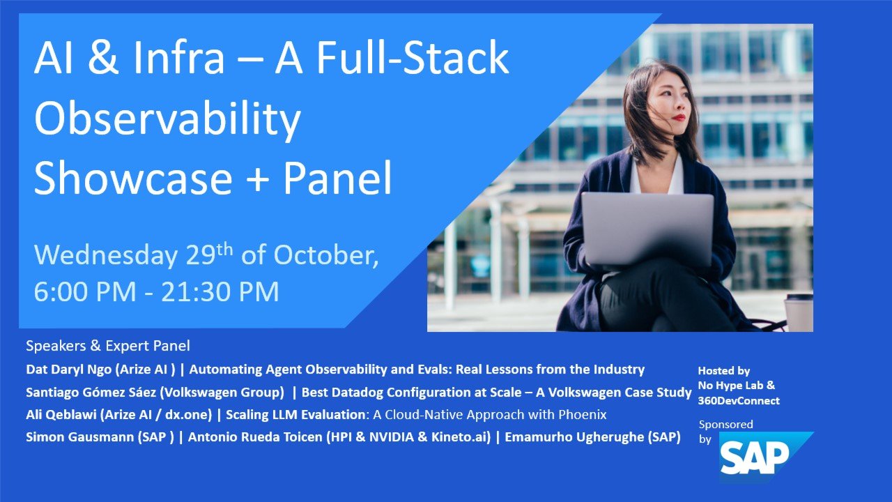 ### *Special Halloween Edition:* **drive out the ghosts in the machine** π» **Details:** Join us on **Wednesday, 29th October (doors open 18:00)** for a **hybrid** (on-site + limited online) edition of our **AI & Infra** meetup β a Halloween special where we uncover the unseen forces haunting modern AI and cloud systems. Expect deep technical insights, live case studies, and a lively panel exploring how teams achieve **observability, reliability, and scalability** across the AI stack. *(Note: Online participation will include the talks and panel stream, but interactive engagement will be limited.)* **Benefit:** Learn directly from **industry experts** at **Arize AI, SAP, Volkswagen Group, NVIDIA, and HPI** how to build transparent, production-ready AI systems. Whether youβre tuning into the stream or attending in person, expect fresh insights, practical takeaways β and a bit of Halloween spirit. π *** ### π‘ **Talks include:** * **Dat Daryl Ngo**, Director of AI Solutions, Arize AI (EMEA/APJ) *Automating Agent Observability and Evals: Real Lessons from the Industry* * **Santiago GΓ³mez SΓ‘ez**, Principal Cloud Architect, dx.one (Volkswagen Group) *Best Datadog Configuration at Scale β A Volkswagen Case Study* * **Ali Qeblawi**, AI Cloud Engineer, dx.one (Volkswagen Group) *Scaling LLM Evaluation: A Cloud-Native Approach with Phoenix* *** ### ποΈ **Expert Panel: Bridging the Gap to Production (and Beyond π»)** **Moderator:** π£οΈ *Emamurho Ugherughe*, SAP AICore **Panelists:** * *Dat Daryl Ngo*, Arize AI * *Santiago GΓ³mez SΓ‘ez*, Volkswagen Group * *Simon Gausmann*, SAP Field Services Management * *Antonio Rueda-Toicen*, Hasso Plattner Institute Β· NVIDIA Β· Kineto.ai Together, theyβll explore how AI and infrastructure teams can collaborate to achieve **full-stack observability**, ensure reliability, and prevent those ghostly bugs from haunting production. *** ### π **Agenda (Berlin Time)** π 18:00 β Doors & Networking & Food π§ 18:30 β Opening Remarks π‘ 18:40 β Lightning Talks π€ 20:00 β Expert Panel π€ 20:45 β Closing & Networking *** ### π» **Why Attend** Come for the **tech insights**, where we **turn haunted systems into observable ones**.. Expect a night of innovation, great company, and maybe a few treats (no tricks). ποΈ On-site spots are limited β RSVP early! π» Livestream access available (limited interaction). **Want More Like This?** π Win Free Tickets to Top AI Conferences β Join the 360DevConnect Mailing List! Are you passionate about AI and looking for opportunities to grow? Subscribe to the [360DevConnect mailing list](https://360devconnect.com/join-us/) for a chance to **win free tickets to global AI conferences** β plus receive exclusive content, resources, and event invitations. As a subscriber, youβll get: * In-depth AI reports and industry insights * Downloadable learning resources (ebooks, cheat sheets, templates) * Access to exclusive webinars and expert sessions * Opportunities to connect with a vibrant AI community π **[Sign up here](https://360devconnect.com/join-us/)** and start receiving value-packed AI updates! \-\-\-\-\-\-\-\-\-\-\- *please note that photographs and/or video recordings may be taken during the event for promotional purposes. By attending, you consent to being photographed and/or recorded for use in promotional materials. If you prefer not to be photographed or recorded, please inform the event organizers. Thank you.*