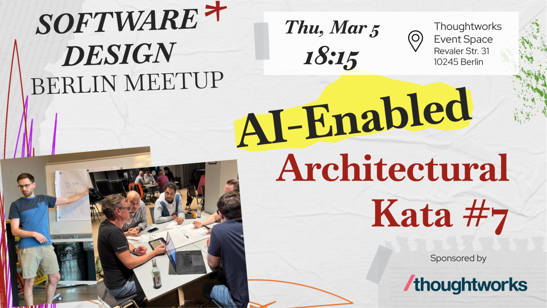 Ready to flex your architectural muscles… with a new twist? Join us for our first **AI-Enabled Architectural Kata**, where we'll tackle a real design challenge together, using generative AI as a collaborator in the architectural process. Small teams will work through a complex scenario, but this time each team gets a unique **AI collaboration role** that shapes how they interact with AI during the session. Expect lively debate, creative solutions, plus an honest reflection on where AI helps and where human judgement still reigns supreme. **Mark your calendars for Thu, Mar 5,** and join us at **Thoughtworks Event Space** for an engaging evening dedicated to software design and architecture. Whether you're a seasoned architect, an AI-curious developer, or just passionate about software design, this meetup is the perfect platform to share, learn, experiment with new ideas and meet passionate people. **Event Schedule** * **18:15** – Doors open for snacks, drinks, and socialization * **18:45** – Introduction * **19:00** – **AI-Enabled Architecture Kata**: Small teams' work session * **20:30** – Presentations by teams **❓ What is an Architectural Kata?** Inspired by the concept of “Code Kata,” Architectural Katas are exercises that allow architects to practice their skills in a real-world scenario. It's about honing our craft in software design through practical, hands-on challenges in small groups. Read more about Architectural Katas on [Neal Ford](https://nealford.com/katas/about.html)'s website or on the [original Katas site](https://www.architecturalkatas.com/) by Ted Neward. **What makes this one AI-Enabled?** Building on the classic Architectural Kata format, this edition adds a new dimension: **AI as a team member**. Each team receives a unique role card that defines how they collaborate with AI during the session. The goal isn't to see who can prompt the best. It's to explore together how AI changes the way we think about, discuss, and communicate software architecture. **What to bring** Please have access to at least one AI tool on your phone or laptop (Claude, ChatGPT, Gemini, or similar). We'll provide a short prompting cheat sheet for architectural AI collaboration to get you started. No prior experience with AI for architecture work is needed! **Venue** **Thoughtworks Event Space**, Revaler Str. 31, 10245 Berlin *(Please note that this is a different entrance from the Thoughtworks office located at Revaler Str. 29)* **Sponsored by Thoughtworks** A big shout-out to [Thoughtworks](https://www.thoughtworks.com/) for sponsoring our event and supporting our mission to foster a tight-knit community of software design practitioners. **Code of Conduct** We adhere to the [Berlin Code of Conduct](https://berlincodeofconduct.org/) to ensure a welcoming and respectful environment for all participants. **Spread the Word** We believe the more, the merrier! If you think this meetup resonates with your friends or colleagues, please feel free to share this event with them. Your personal recommendation would not only enrich our community but also enhance the overall experience for everyone involved. You can easily share this event by forwarding this invitation or sharing our event link on social media. Let's grow our community together and make this inaugural meetup a memorable and valuable experience for everyone! **Hosting and Sponsorship Opportunities** Interested in hosting or sponsoring future events? Check out our [Sponsor proposal](https://docs.google.com/document/d/1tXMpuB3L0x1lQKsDgO2YftWx6LATfMZADwrZwP2Ylg0/edit?usp=sharing).