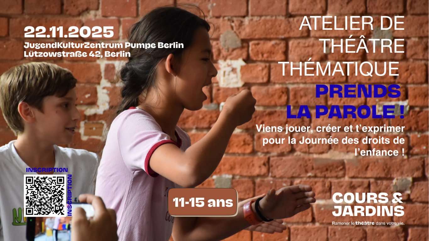 *Viens jouer, créer et t’exprimer à l’occasion de la Journée des droits de l’enfant !* *Avec le théâtre et un peu d’imagination, tu pourras :* * *inventer des histoires,* * *improviser des scènes,* * *écrire et partager tes idées,* * *rigoler et t’amuser avec d’autres ados.* *Et surtout, fais entendre ta voix, avec tes mots, ton énergie, ton humour et ta poésie. Parce que ce que tu as à dire compte, et nous avons hâte de t’écouter !* *Date : 22 novembre 2025* *Horaire : 10h – 16h30* *Public : 11\-15 ans \| Ados francophones* *Animatrice : Anaïs Caillaud , pédagogue de théâtre* *Inscription: [https://widgets.yolawo.de/w/0/bookables/6890cda4cf3c3b3dcfdc162d](https://widgets.yolawo.de/w/0/bookables/6890cda4cf3c3b3dcfdc162d)*