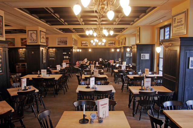 Bavarian-style beer hall, with a dark wood-paneled ceiling & walls, serving South German cuisine.