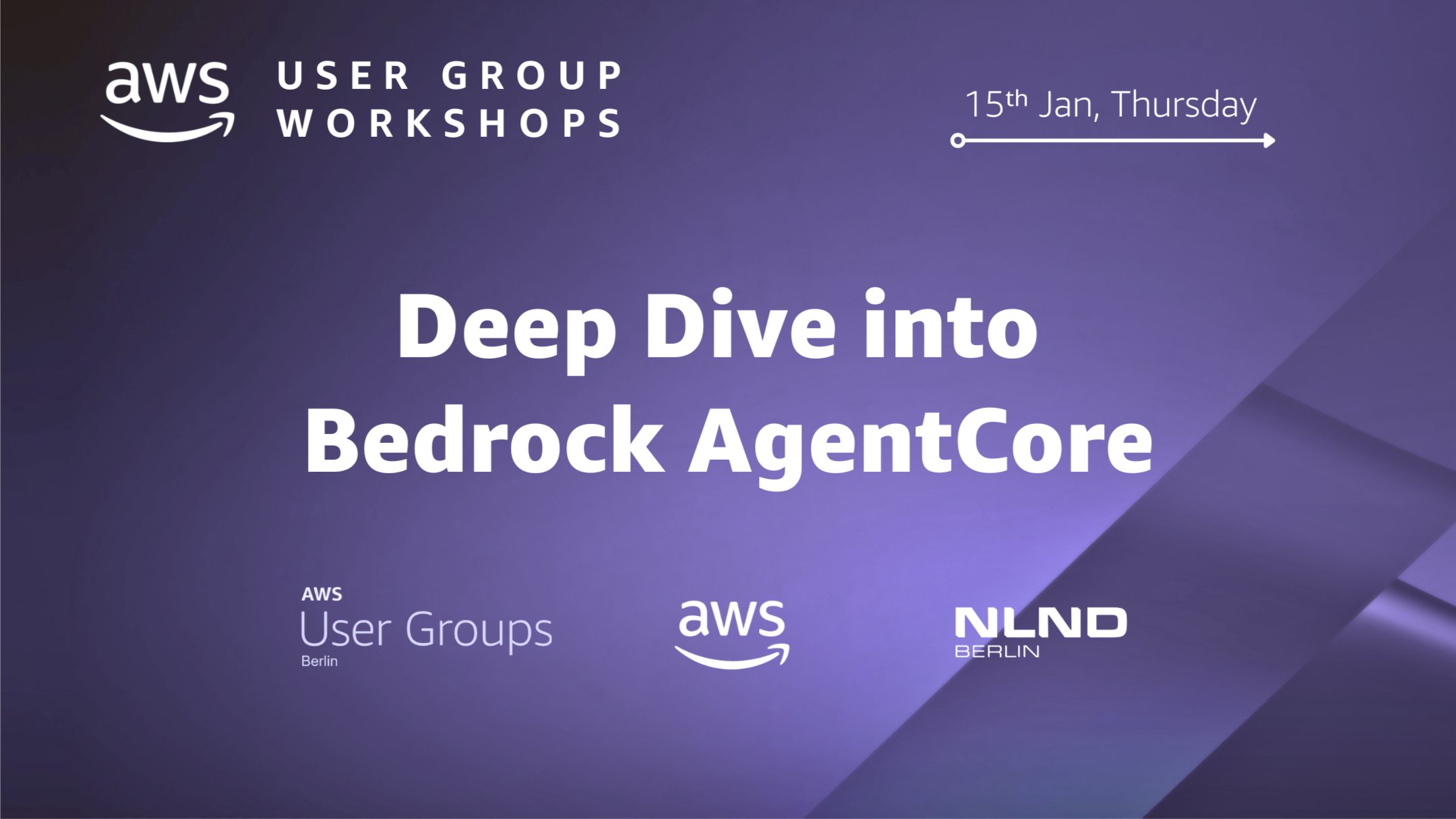 An exciting start to the new year with an excellent workshop on agentic features of AWS. We gather at NLND Berlin once again, with expert Solutions Architects from AWS joining us to facilitate another highly appreciated User Group Workshop. **Deep Dive into Bedrock AgentCore** This is a level 300, hands-on workshop with a practical deep dive into Amazon Bedrock AgentCore and its main services: Runtime, Gateway, Memory, Identity, and Observability. You work through independent labs that you can pick and choose from, learning how to build, deploy, and operate production-ready AI agents on AWS. By the end of the workshop, we aim that you understand how to connect agents to tools and data securely, scale them in the cloud, and monitor their behavior so they are ready for real time use. This workshop is aimed at data engineers, AI developers, cloud specialists. While it is not necessary to work in the AI field, the workshop requires some intermediate level knowledge on the topic. Therefore, please consider learning on AI & Agentic topics in advance before joining and make sure that you can follow the workshop. **When?** 15th of January\, Thursday \| 12:30 \- 18:00 **Where?** NLND Berlin: Neuköllnische Allee 80, 12057 Berlin **How?** Fill out this form to apply. Limited seats are available. You can only participate in the workshop if you receive a confirmation mail from us (kadir@berlinawsug.de). You need to bring your own laptop to this workshop. ❗**Registration - Read Carefully**❗ Participation is free of charge. Your AWS resource usage is also covered. You will be provided a sandbox AWS account. Therefore, you won't need an AWS account! ❗Please register with your full name by filling out this form: https://forms.gle/yXKpbyzgWirM1oM97 ❗You need to bring your own laptop to this workshop. Make sure AWS CLI is installed. Contact us if you're not sure how. ❗A confirmation e-mail from Meetup is not relevant. You can participate only if you receive a confirmation from us: kadir@berlinawsug.de \-\-\- **Additional Information** **This event is wheelchair friendly.** Help us spread the word, and invite your friends & colleagues! If you're attending with wheelchair and need assistance, please mail us: [organisers@berlinawsug.de](mailto:organisers@berlinawsug.de) for further details. Would you like to host AWS UG Event at your company? [Register here](https://bit.ly/aws-host) Would you like to speak at AWS UG MeetUp?[Submit your topic here](https://bit.ly/aws-talk)
