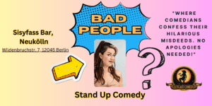 “Bad People: A Stand Up Comedy About Bad Things + the people who did them!” Brace yourselves for a night where comedians confess their most outrageous deeds! Standup comedy, revealing the perfectly imperfect side of our favorite stand-ups. From petty crimes to grand misadventures, they prove that being a little ‘bad’ can be hilariously good. Join us for an evening of guilty pleasures, no apologies needed! ENGLISH SHOW. Perfect show to go to before your evening plans!! Venue: Sisyfass Bar, Neukolln Wildenbruchstr. 7, 12045 Berlin Instagram: Venue: SisyFass (@sisy_fass) • Instagram photos and videos Host: Tera Kilbride (@teracomedy_) • Instagram photos and videos, https://terakilbride.com Drinks available to buy! Great fun area… Time: 19 Doors, 19:30 Showtime. Ends by 20:40 latest. Cost: Pre-Paid Tickets Online for 10 Euros, At the Door for 13. Book: Venue is super cute + totally unique vibes! PLEASE book a seat. Your bookings help us run the show! This is an ENGLISH EVENT. Comedy Club Vibes!! Tera/Outcast Comedy has been running events in Berlin over 4 years — over 500 events. You can TRUST the QUALITY. Host: Tera Kilbride, Website: Tera Kilbride: Comedian, Host, Producer | Creating events in Berlin + traveling through Europe Instagram: Tera Comedy Page (@teracomedy_) • Instagram photos and videos Outcast Comedy Club (@outcastcomedyclub) • Instagram photos and videos .