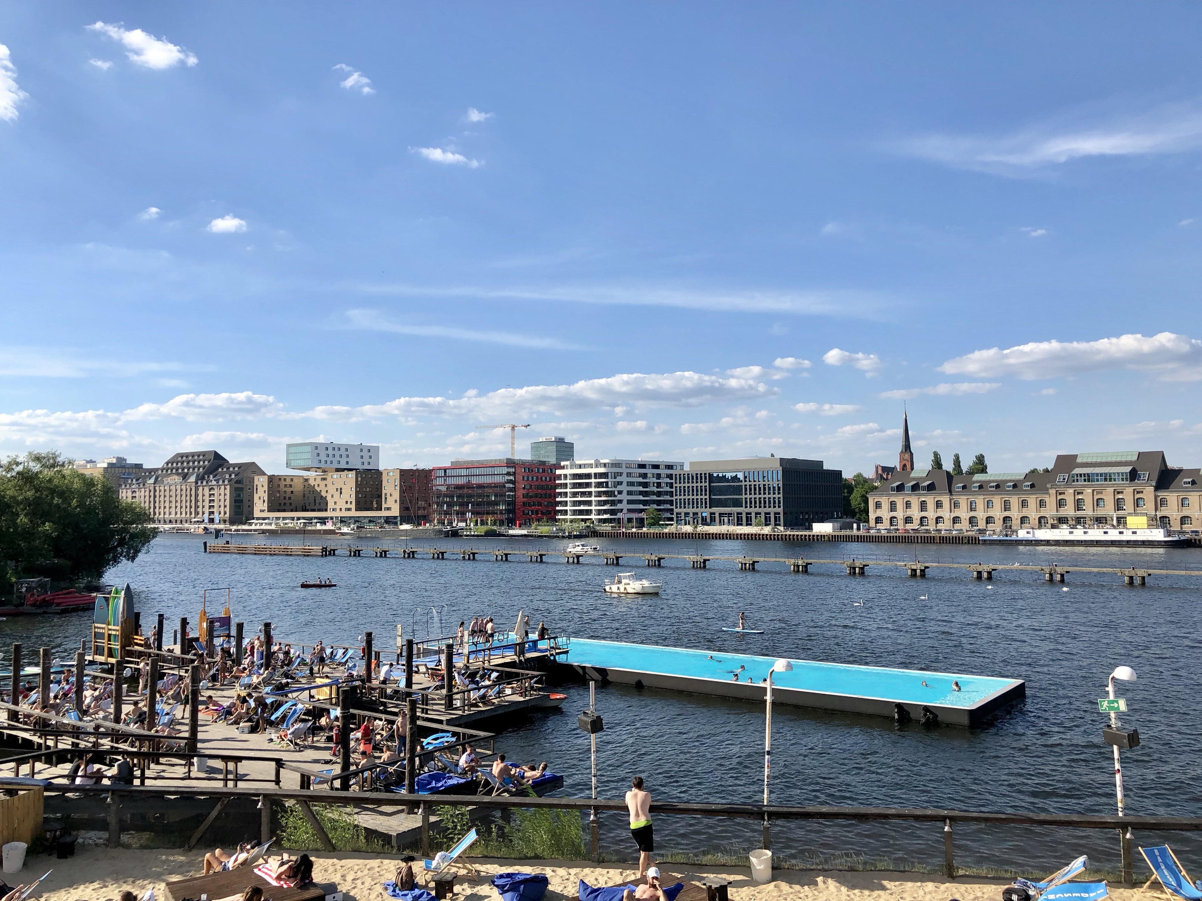 Seasonal floating swimming pool in a harbored barge on the Spree River with a nearby beach bar.