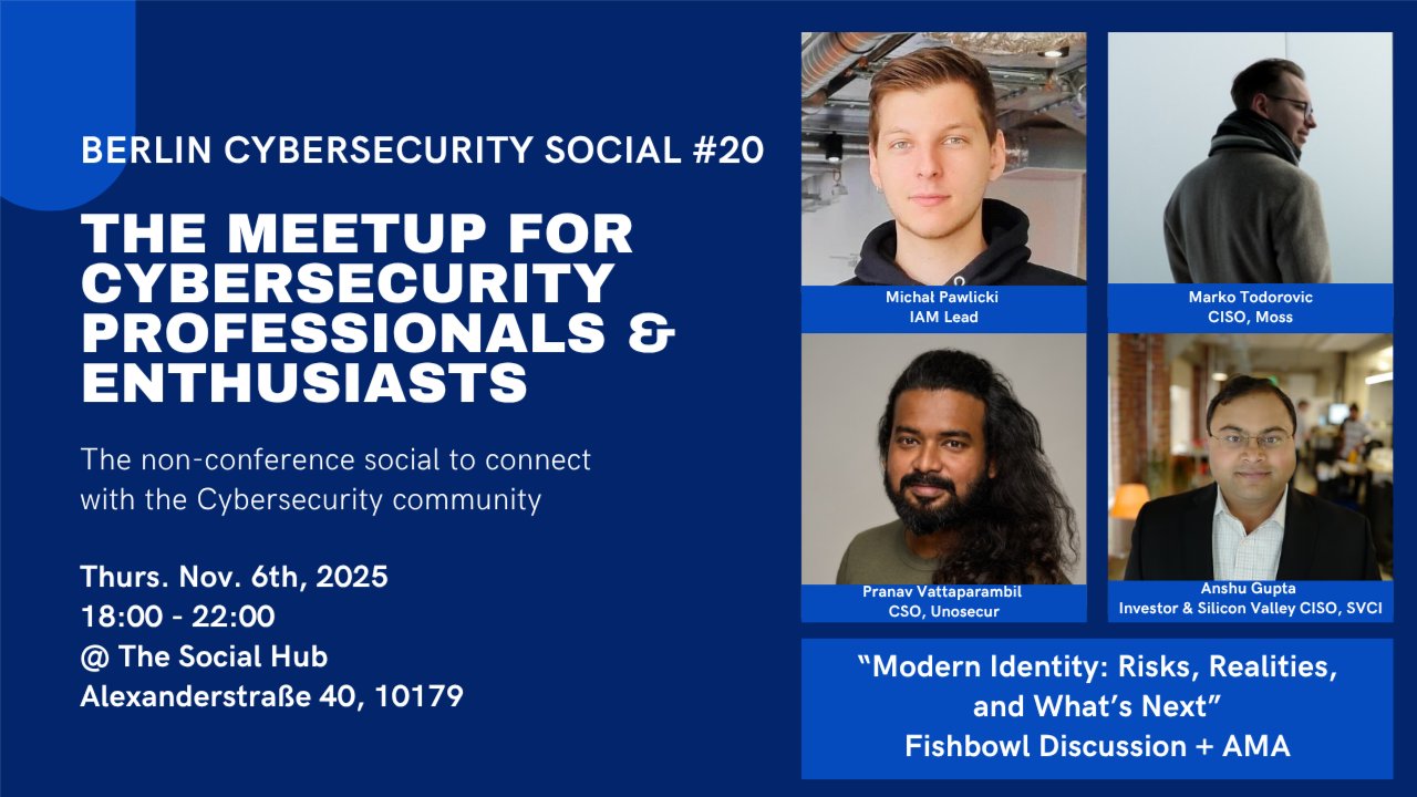 Are you a cybersecurity professional looking to connect with like-minded professionals, share experiences, and make friends? Look no further! **Agenda:** * **6:00 PM - 6:30 PM:** Welcome * **6:30 PM – 7:15 PM:** Fishbowl Discussion: "Modern Identity: Risks, Realities, and What’s Next" with Michał Pawlicki, Marko Todorovic, & Pranav Vattaparambil * **7:15 PM – 7.30 PM:** Refreshment & networking break * **7.30 PM – 7.50 PM:** AMA with Anshu Gupta investor and former Silicon Valley CISO. * **7:50 PM - 10:00 PM:** DIY Networking & socializing The identity landscape is changing fast and with it, the challenges around access, control, and visibility. \* As organisations adopt more cloud services, automate workflows, and rely on non-human identities, IAM (Identity Access Management) has become one of the most discussed topics in security today. \* This month we're bringing together perspectives from leadership, practitioner and solution sides to discuss: \* * The factors driving IAM’s growing importance * The rise of non-human and service identities * Key risks in identity lifecycle management * What mature IAM programs will look like in 2026 and beyond **For this Fishbowl Discussion edition: bring your questions and challenges around Identity Security as we'll be opening the floor to engage in a fishbowl format https://en.wikipedia.org/wiki/Fishbowl_(conversation) and mastermind with our experts!** **Who is this for?** * Security professionals and IAM practitioners * IT and cloud security leaders * CISOs and security architects defining IAM strategy * Engineers and analysts interested in identity risks and automation * Cybersecurity enthusiasts looking to learn from real-world experiences **About the speakers:** **Michał Pawlicki** is an Identity and Access Management (IAM) specialist dedicated to building and implementing robust workforce identity solutions. Currently, he's diving into the complexities of regulatory compliance within the financial industry, following his impactful experience driving IAM adoption and efficiency across the logistics sector. **Marko Todorovic** is a Chief Information Security Officer (CISO) with extensive experience building and leading security programs in regulated industries. His background includes key security leadership roles at N26, Holvi, and most recently Moss. Marko specializes in cybersecurity, data privacy, information risk management, and compliance, driving cross-functional initiatives that strengthen organizational resilience and ensure adherence to regulatory standards. He is also a guest lecturer at the University of Zagreb, where he delivers sessions on Information System Auditing and Security, sharing practical insights and bridging academic theory with real-world application. **Pranav Vattaparambil** is a security and product strategist with deep expertise in fintech. Formerly VP of Cybersecurity at the EU’s largest Banking-as-a-Service company, he is currently CSO at Unosecur, a Berlin-based IAM security company. He also advises multiple startups on navigating security, risk, and go-to-market strategy. Pranav bridges the gap between technical execution and business impact, especially in regulated industries like banking and crypto. **Bonus AMA** “Scaling Security from Startup to Silicon Valley” with Anshu Gupta (SVCI, ex-Fast, SPAN, Varo Bank) **Anshu Gupta** is investor at Silicon Valley CISO Investments (SVCI) and former VP of Security & Privacy at SPAN and Fast. Anshu has built and led security programs at some of the Valley’s most innovative startups: from helping Fast reach PCI DSS Level 1 compliance within a year to shaping Varo Bank’s security program that supported its FDIC approval. As part of SVCI, he now advises and invests in the next generation of cybersecurity startups. **About Berlin Cybersecurity Social:** This meetup is open to cybersecurity professionals of all levels, from beginners to experts. Whether you're a seasoned pro or just starting your journey in the field, this event is the perfect opportunity to connect with others who share your passion for cybersecurity. **About The Social Hub Berlin:** The Social Hub is a hotel, coworking, and student accommodation in the Mitte district that serves as a community hub for travelers, locals, students, and digital nomads. It offers spaces to learn, work, and socialize, with amenities like a gym, event spaces, and restaurants and bars, all designed to foster connection and a vibrant atmosphere.