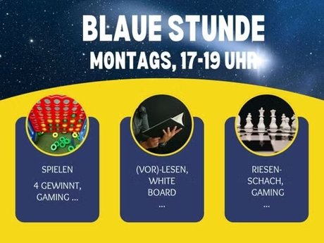 A time slot with changing open activities for young and old in the library or in the event room. For example: games (giant chess, Vier gewinnt…), gaming or reading (aloud).