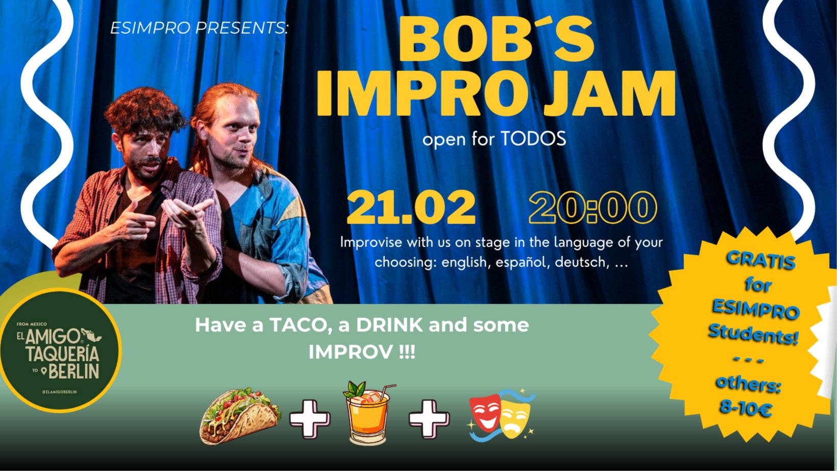**This Jam is Open for everybody!** Berlins famous Improv Duo „**Waiting for Bob**“ (Gonzalo and Konstantin) is dragging everybody who wants to be on stage in front of an audience and improvise with them. In what ever language you want to, **english, español, deutsch, korean**?? even if we dont speak it, lets go. Have a Taco and some Drinks In the beautiful „El Amigo Taqueria“ in the mexican heart of Berlin Mitte. And than Improvise with us! Or just watch and laugh your ass off. Bring the Community together, the stage is waiting for you! Students of ESIMPRO: free entrance **Ticket normal: 10€** **ermäßigt: 8€** at: https://www.tickettailor.com/events/esimpro Follow for more: @waitingforbob @berlinesimpro @esimproenglish