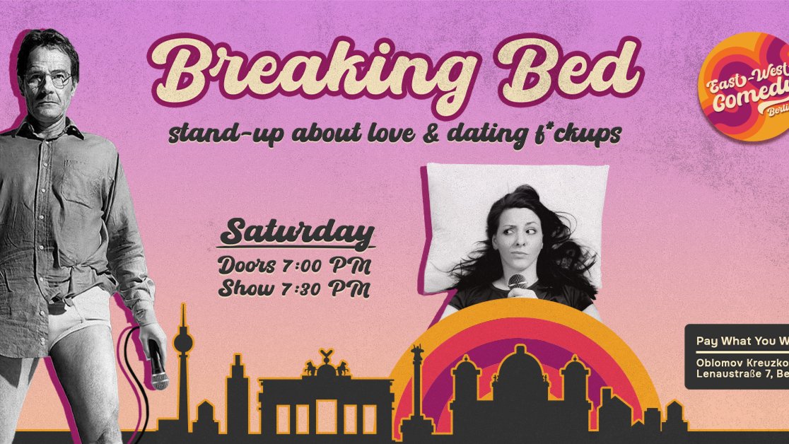 **Line-up TBA** **English Comedy Special that will finally make you delete the dating apps - because there's no hope! Featuring 4 headliner level comedians!** Please sign up at [eastwestcomedy.com](eastwestcomedy.com) in addition to RSVP here to guarantee seating !! Our Saturday shows have been SOLD OUT almost every time, so PLEASE book online and don't take chances ;) !! **Neukolln's favorite (by popular vote) comedy club East-West Comedy presents the new, topical show all about love & dating f\*ckups! In Berlin, you don't know who to hate the most: emotionally dead weirdos you meet online, people who refuse to pay the asking price for your feet pictures on OnlyFans, or the smug, preachy couples they form when they find each other. Is there any actual hope? Nah. But there are funny stories to tell to your closest friends (or to a room full of drunk strangers for money). 4 experienced comedians from USA, UK, Europe, Asia and more, will possibly kill your last remnants of hope - but promise you'll have helluva fun in the process.** Google rating: 5.0 / 5.0 ★★★★★ “Laughed a lot, will come again for sure” Oliver, UK ★★★★★ “A cozy place with high quality live comedy!” Joanna, Hong Kong ★★★★★ “Great comedy show, talented comics and very nice atmosphere” Mariia, Ukraine ★★★★★ “Comedians were good, beer was good, ambiance was super nice!” Gaelle, Lebanon ★★★★★ “The humour hit us right on the spot!” Eve, China ★★★★★ “Perfect evening of laughter” Igor, Croatia ★★★★★ “Cozy stand-up venue with hilarious international artists and audience!” Elvira, Russia ★★★★★ “Great new shows at one of Berlin’s coolest venues!” James, USA Doors: 7:00 PM Show:7:30 PM Entry: Pay What You Want\* (seat reservation required): you reserve your seat for free, and Pay What You Want at the end of the show, depending on how much you think the show is worth (recommended fee: €10-15). Reservations expire 10 minutes before the start of the show. \*It is not within our principles to promote a show as "Free Entry" and ask for a "not-so-voluntary" donation at the end. This show is paid - we just let you decide the price ;)