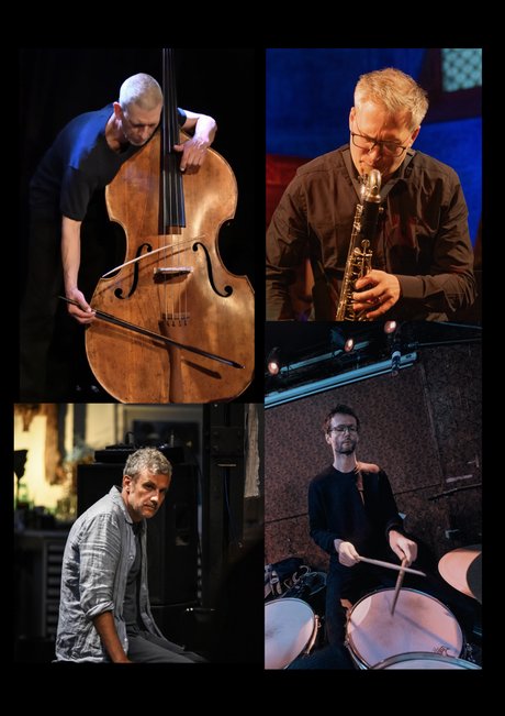 Quartet featuring clarinet, saxophones, piano, double bass, and drums in contemporary jazz improvisation.