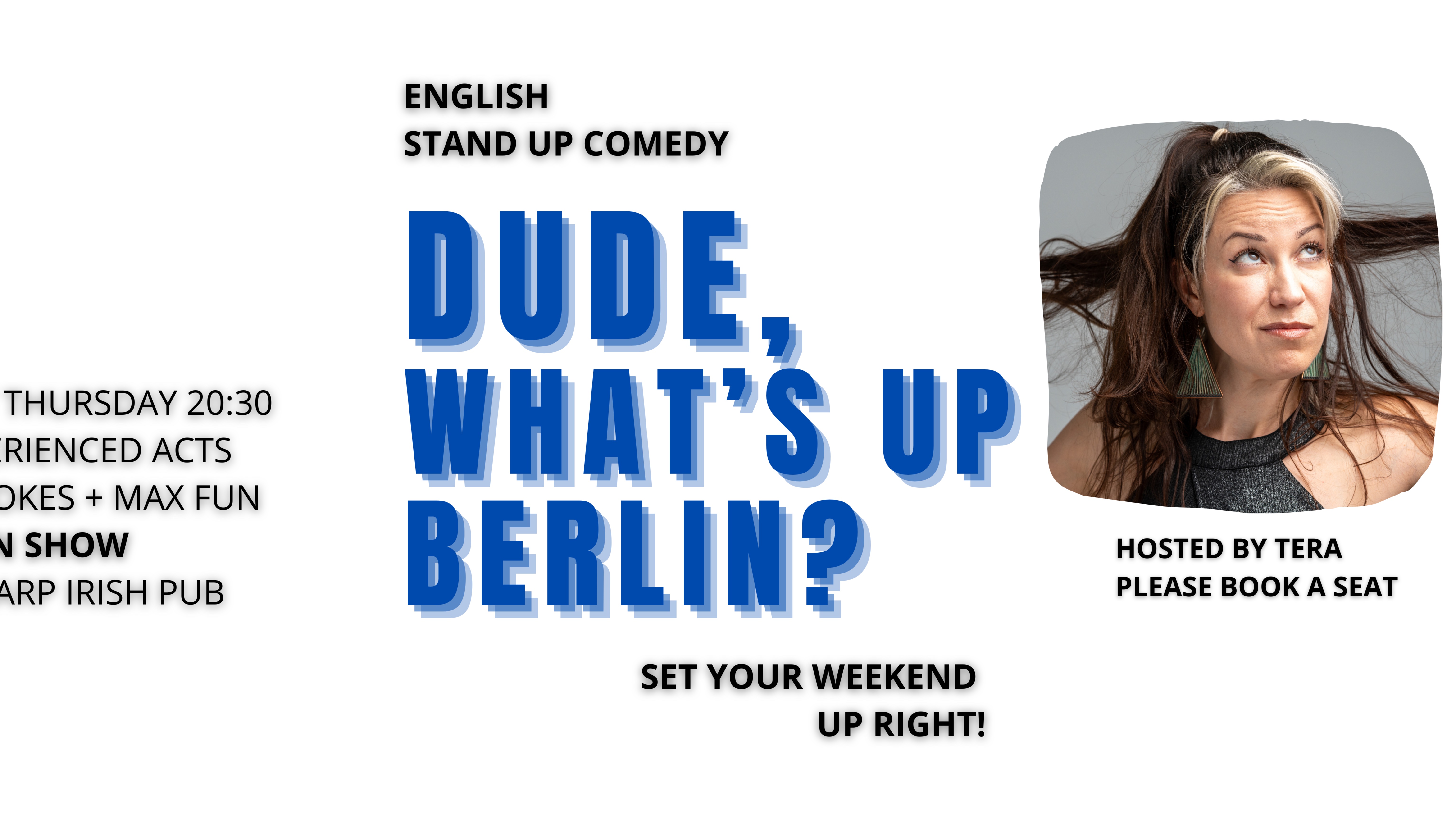 One of Berlin´s BEST and longest running weekly shows is back! NOW AT THE HARP IRISH PUB. 70 min. Show. [BOOK HERE](https://www.eventbrite.com/e/681534878167?aff=oddtdtcreator) Love expats and immigrants? Can´t stand us? Come with friends, with enemies, international co-workers or family for laughs; drink available in the bar before and event the show. We bring together 4 of Berlin´s most regularly working/hustling stand up comedians, from all over the world, for a night of fun. Start your weekend right! SHOW: Doors open at 20:00 for drinks. \*\*\*You must arrive by 20:15 to claim your booking! Show starts promptly at 20:30. 70 min show. NOW PAY AT THE END. Book online for guaranteed seat. Pay by cash or card.🎟 Guarantee your seat for 3€ - no matter how packed, you will have a laugh with us! This is a donation based show (suggested donation at the end of the show is 10-12€ with a reservation, 13-15€ without a reservation), and we accept cash or card. First we make you laugh, then we take your money. We hold reservations until 15min before the show starts. So, join us early and get the best seats. YOUR HOST TERA has over 25 years of stage experience, this will be a great show! IG: [https://www.instagram.com/teracomedy_/](https://www.instagram.com/teracomedy_/) WEB: [https://terakilbride.com/](https://terakilbride.com/) VENUE [https://theharp-berlin.de/en/home/](https://theharp-berlin.de/en/home/)