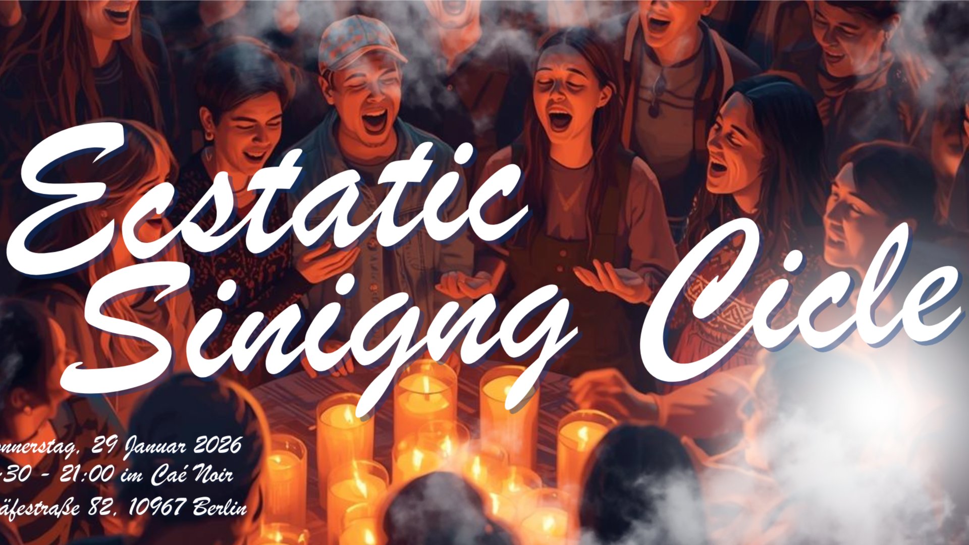 *(english version below)* Gemeinsam auf klangliche Reise gehen: **Meditation — Mantras — Transformation** Lass uns das neue Jahr mit einer tiefen Erfahrung beginnen. Für mich ist Singen das direkteste Medium, um in ekstatische Zustände einzutauchen und Altes zu wandeln. Wir starten sanft, singen uns gemeinsam in die höchsten Sphären und setzen später wieder zur Landung an. Die Formel ist simpel: **Singen und bewegt werden.** Wir kommen als Gemeinschaft zusammen, um uns zu verbinden, loszulassen und Gefühlen Ausdruck zu verleihen. Ob du ein Thema transformieren willst, die Energie für einen Neuanfang suchst – oder dich einfach im Klang verlieren willst: Du bist herzlich willkommen. **Während des Abends:** * Kein Leistungsdruck: Deine authentische Stimme ist genug. Es geht um Ausdruck, nicht Performance. * Spiritueller Fokus: Wir singen Mantren, Kirtans und Spirituelle Lieder (begleitet an der Gitarre). * Safe Space: Ein gehaltener Rahmen für alles, was sich zeigen will. * Afterwork vibe: Getränke und Gebäck im Café helfen dir, während oder nach dem Kreis zu landen. **WANN** Donnerstag, 29. Januar 2026 * 18:30 – Ankommen & Einchecken * 19:00 – Beginn * 21:00 – Community Zeit & Ausklang **WO** Café Noir Gräfestraße 82, 10967 Berlin **WIE** Bitte bring eine Spende in bar mit (Empfohlen sind 10-25€, je nachdem wie viel du geben kannst. Let’s gather for a sonic journey: **Meditation — Mantras — Ecstatic Singing** This Singing Circle is a space to explore your voice as a medium for transformation. We start in stillness, journey through meditative chants into high-energy ecstatic states, and return for a soft landing. The formula is simple: **Sing and be moved.** We gather in community to connect and release, to feel and express. Whether you want to transform a specific theme—like grief, anger, or the spark for a new beginning—or simply want to lose yourself in the sound: you are welcome. **During the journey:** * No performance pressure: Your authentic voice is enough. * Spiritual focus: We sing Mantras, Kirtans, and medicine songs. * Safe Space: A held environment to express what is there. * Afterwork Vibe: Drinks and snacks are available at the café to ground yourself during or after the circle. **WHEN** Thursday, 29. January 2026 * 18:30 – Arrival & Getting settled * 19:00 – Circle begins * 21:00 – End & Community chill time **WHERE** Café Noir Gräfestraße 82, 10967 Berlin **HOW** Please bring a cash donation (10-25€ recommended - depending on how much you can give)