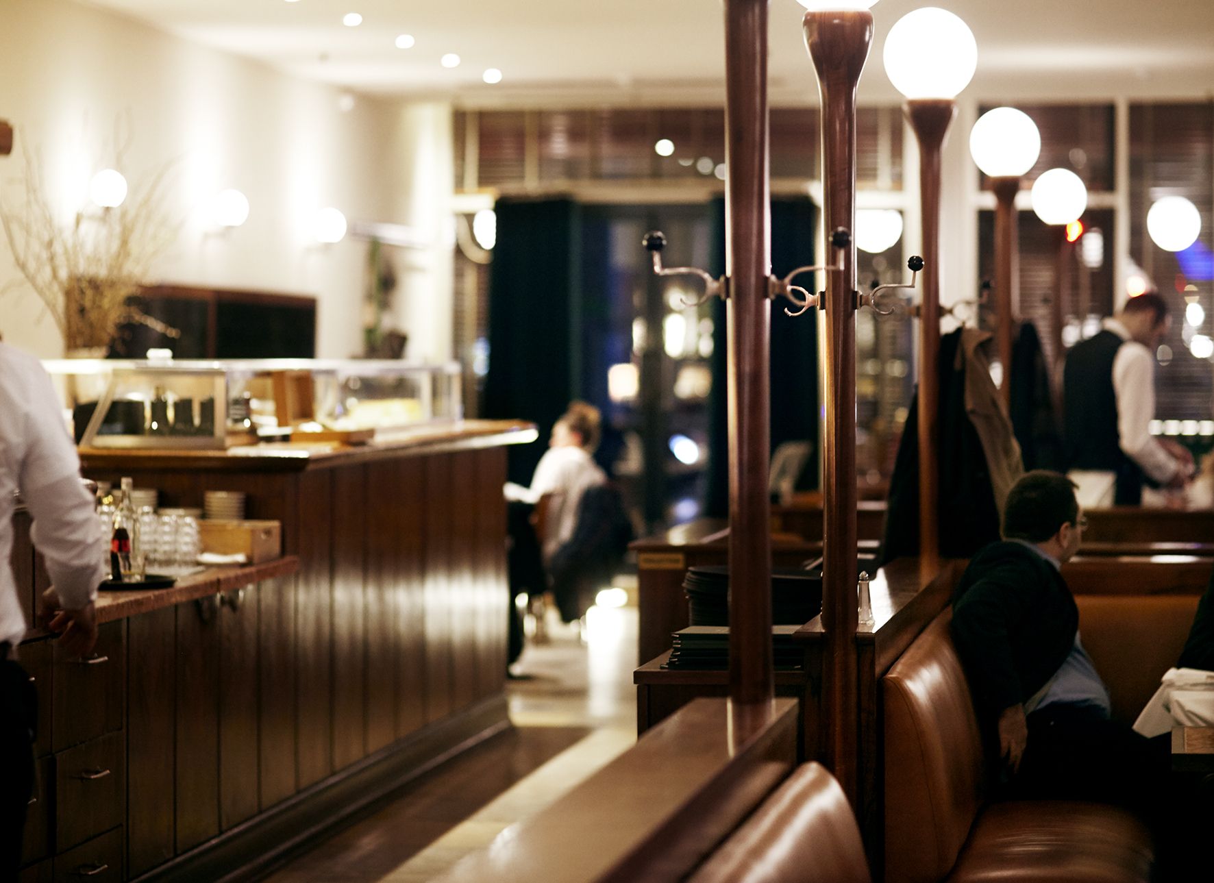 Stylish cafe-restaurant with historic feel, framed photos, dark wood, plus booth & sidewalk seating.