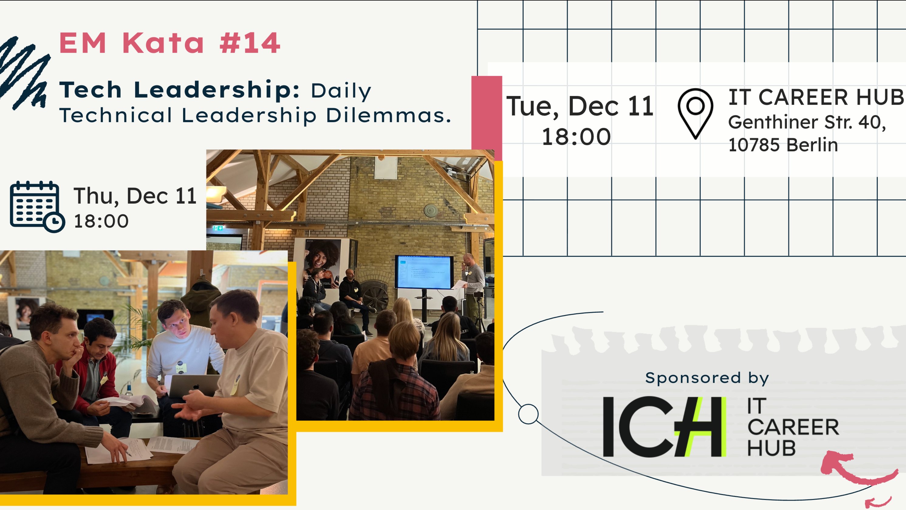 **Every day, EMs need to make a variety of decisions.** These often seem small and require quick action. Yet such decisions can significantly influence the product's future, the team's future, and professional growth. **Let’s practise making them effectively together.** This time, we will play small Blitz EM Katas. Each small group will tackle two Blitz EM Katas, and together all participants will solve four. More EM Katas, more feedback from the jury, and greater opportunities for practice. Plus, a few other exciting innovations you’ve been asking for! **😊🍕 Support Our Food Fund for meetup** For EM Kata #14, only the venue is sponsored — **food and drinks are up to us**. We’d love your support to get some tasty food, so we’re all well-fed, happy, and ready to practise our skills together. 🤝 **Contribute via** [PayPal fundraising](https://www.paypal.com/pools/c/9k7Ewrjxca). ❗❗❗ **Register here** ➡️ https://lu.ma/fsi8d0qk ⬅️ ❗❗❗ **❓ What is an EM Kata?** EM Kata is a playground where Engineering Managers\* can practice their skills and receive immediate feedback. **\* - 👨🔬 / 👩🔬EM Kata is also beneficial for** * **Senior Leaders:** Head of Engineering, Engineering Directors, VPs, CTOs - to practice and enhance mentoring and coaching skills. * **Tech/Team Leads:** To acquire essential skills for a successful transition to an EM role. * **Senior Software Engineers:** To gain insight into EM responsibilities and explore if a leadership career path interests them. * **Agile Coaches:** To better understand the challenges faced by EMs and the skills they require, enabling better support for them at work. Each small group works on identifying the root causes of the challenges by analysing them from different perspectives, determining the most efficient strategy to solve them, developing a detailed plan, and making necessary team constellation changes & architecture. **🕑 Event Schedule** 18:00 – Doors open for snacks, drinks, and networking 18:30 – Introduction 18:50 – EM Kata: working and forecasting in small groups 20:00 – Senior Leadership round: challenging assumptions, shaping the future From 21:00 to 21:30 — Networking and discussions. **📍 Venue** **[IT CAREER HUB](https://itcareerhub.de/)** Genthiner Str. 40, 10785 Berlin **📣 Spread the Word** **Love our meetups?** Help us grow the community! Share your experience on LinkedIn—whether it’s what you’ve learned, key takeaways, or why you enjoy EM Kata. By spreading the word, you’ll help more engineering managers and aspiring tech leaders find a safe environment to practice and enhance their skills. We believe it’s much more fun to have fun with friends, so come join us and bring your friends along! Tag us **#EMKata #Meetup by #SEML about #TechLeadership**. **🤝 Sponsored by [IT CAREER HUB](https://itcareerhub.de/)** A big shout-out to **[IT CAREER HUB](https://itcareerhub.de/)** for sponsoring our event and supporting our mission to foster a tight-knit community of engineering leaders. **👍 Code of Conduct** We adhere to the [Berlin Code of Conduct](https://berlincodeofconduct.org/) to ensure a welcoming and respectful environment for all participants.