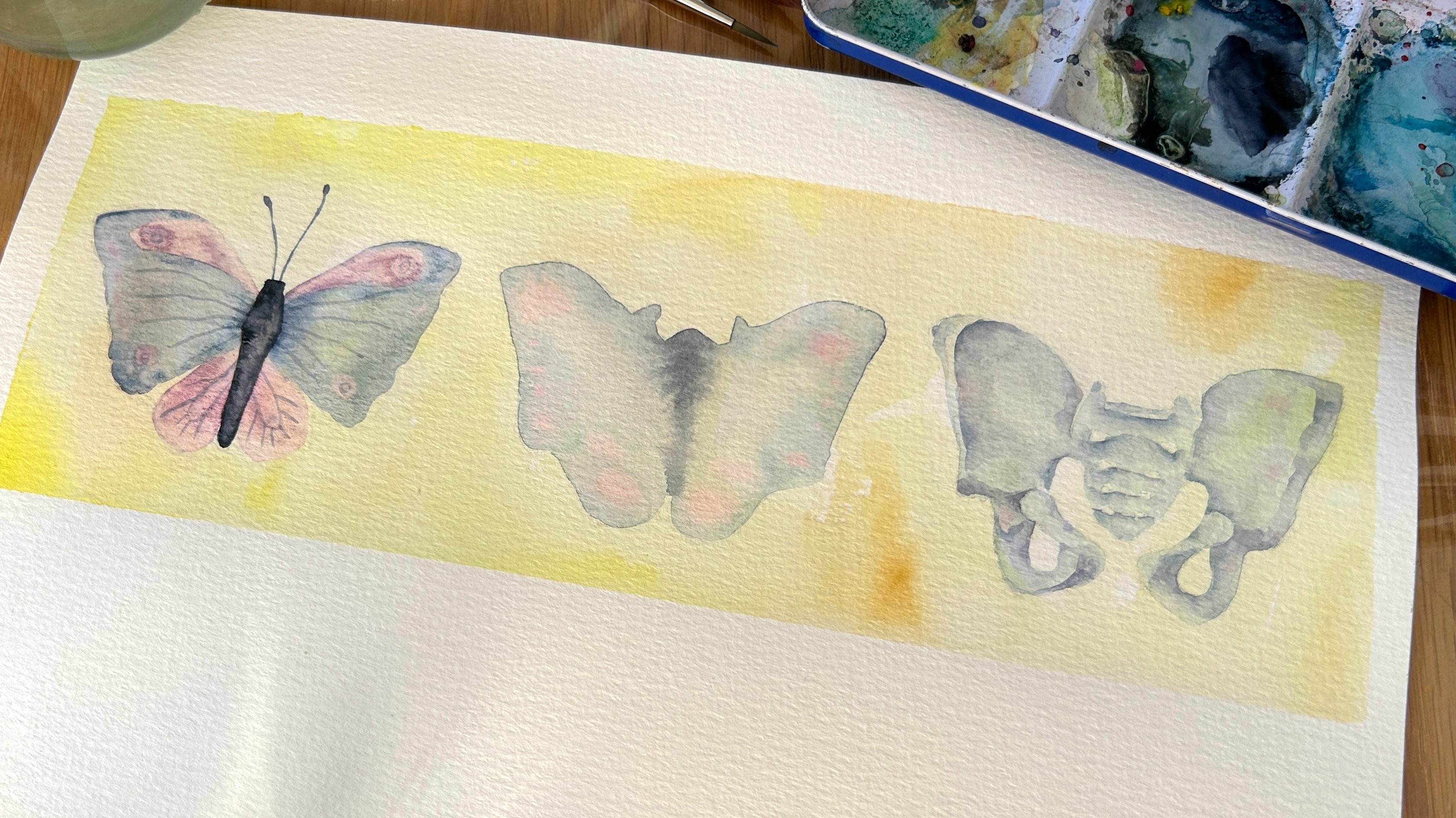 Over four classes, we will explore bones, muscles, and organs in a fresh and expressive way. Using watercolour techniques that embrace fluidity and transparency, we’ll experiment with water, stains, textures, and layering to create our own artistic vision of the body.