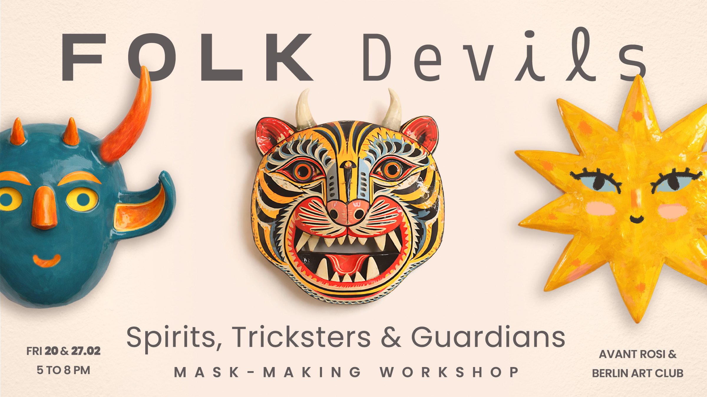 **Welcome to a new Mask-making Workshop!** As Carnival approaches, we are excited to invite you to a new, two-day hands-on mask-making workshop inspired by folk devils, spirits, and popular mythological figures from Latin America and Central America. This workshop combines cultural references, imagination, and craft, inviting participants to create their own expressive folk mask using recycled materials. No previous experience is required. In this context, devils are not symbols of evil. They represent creative **chaos, irony, protection, transformation, and vital force.** These figures often blur the line between human, animal, and spirit, appearing as guardians of the land, playful tricksters, or exaggerated reflections of social power and fear. **Day 1: Symbols, Archetypes & Design** We begin with a short cultural introduction about what the “devil” represents in Latin American folk traditions. We will explore visual examples from traditional masks and popular celebrations: folk spirits, tricksters, and hybrid animal–human figures. We will then choose a personal archetype to work with. Using a template as a base, and through quick sketches, we will design and define: • Expression: rage, irony, mystery, laughter. • Horns, nose, fangs, beard, beaks, ears, snouts • Human, animal, or hybrid forms By the end of Day 1, each participant will have a clear mask concept and begin **building the base structure with recycled cardboard and paper-maché**, which will be left to dry before the second session. **Day 2 — Painting & Finishing** We will bring the masks to life through finishing, colour, textures, and expressive accents. You will get insights on choosing your colour palette, mixing colours and painting with acrylic to get different finishing effects. The workshop closes with a collective sharing moment, where participants can present the character, spirit, or creature behind their mask. **Dates:** Friday 20 + 27.02.26 from 5 to 8PM. **Address:** In Friedrichshain. Exact address by e-mail. **Price:** 110€/ 90€ for regular students. Materials are included as well as drinks and snacks. **Materials:** All basic materials are included (Cardboard, paper, paste, papier-mâché, acrylic colours, fabric and thread, natural elements such as seeds, wood, fibres, or decorative details) We encourage you to bring your unique elements (your own special colours, personal materials or objects, small found items, fabrics, feathers, textures, or symbolic elements connected to your mask) **How to sign up?** Please send an email to **hola.berlinartclub@gmail.com,** and you will receive the registration form with all the details of payment and the exact address. Limited spots. About the teacher: **Rosi Diaz Roigt** is a graphic designer and illustrator with over 7 years of experience working with film production teams, bringing fictional characters to life through graphic design, prop creation, and movie posters. Passionate about art and sustainability, she specialises in exploring the creative possibilities of recycled materials. Her work draws inspiration from the beauty and power of nature, blending storytelling and eco-conscious design. **Find her work here:** [https://www.instagram.com/avant.rosi/](https://www.instagram.com/avant.rosi/) See you!! Rosi and the Berlin Art Club