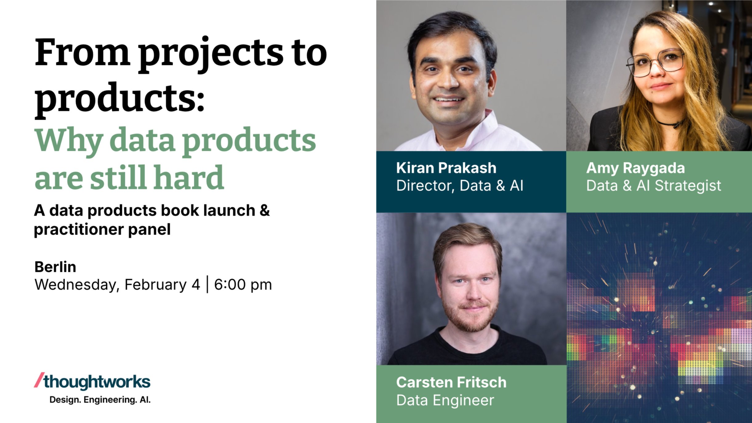 **From Projects to Products: Why Data Products Are Still Hard** A Data Products Book Launch & Practitioner Panel **About the event** This meetup marks the release of **Amy Raygada’s new book on Data Products** and explores why, despite years of discussion, data products are still hard to implement in practice. Data products are not a new concept. For years, organisations have talked about treating data as a product — with clear ownership, well-defined interfaces, and measurable business value. And yet, many teams continue to struggle with fragmented dashboards, inconsistent metrics, and slow, reactive delivery. So why is this still so difficult? In this meetup, we’ll unpack why data products remain hard in practice — not because teams lack tools or frameworks, but because meaning, ownership, and operating models are often misunderstood or only partially implemented. Through in-depth practitioner talks and discussion, we’ll explore: * Why data initiatives often slip back into project mode * Where ownership breaks down across domains and platforms * How weak semantics and unclear definitions erode trust * What changes when data products are treated as long-lived products rather than delivery artefacts * Why AI and advanced analytics amplify these challenges instead of solving them The conversation is grounded in real delivery experience across engineering, architecture, and data strategy. It also features insights from Amy Raygada’s newly released book, which captures lessons learned from years of hands-on work helping organisations move from intent to execution. Expect practical perspectives, honest trade-offs, and an open discussion — not hype, not vendor pitches, and no one-size-fits-all answers. **About the speakers** **Amy Raygada** Principal Data & AI Strategist at Thoughtworks \| Author Amy Raygada is a Principal Data & AI Strategist at Thoughtworks, with over a decade of experience helping organisations design and govern data products that deliver real business impact. Her work spans data product strategy, governance, operating models, and AI readiness, with a strong focus on aligning technical capabilities with decision-making. This meetup marks the release of her new book on Data Products, bringing together lessons from years of real-world delivery across industries. **Kiran Prakash** Director, Data & AI at Thoughtworks Kiran Prakash is a Director in the Data & AI service line at Thoughtworks, working with organisations to design and scale data-driven systems. In his talk *“What We Talk About When We Talk About Data Products,”* Kiran presents a practical approach to designing, implementing, and governing data products. Drawing on real-world experience, he clarifies what data products are — and what they are not — and explores how teams can work backwards from use cases, apply adaptable implementation patterns, and use governance mechanisms such as fitness functions to keep data products aligned over time. **Carsten Fritsch** Principal Data Engineer at Thoughtworks Carsten Fritsch is a Principal Data Engineer at Thoughtworks in Berlin, with deep experience in data engineering, analytics architecture, and data modelling at scale. His work focuses on semantic layers, shared metrics, and the practical challenges of operationalising meaning across organisations. Carsten brings a grounded perspective on why semantics are foundational to trustworthy data products — especially as organisations move toward AI-driven use cases. **Format** * Each speaker will deliver a **25–30 minute talk**, followed by **Q&A** * Final **panel discussion** with all speakers * Open audience Q&A * Informal networking and book signing \-\-\-\-\-\- **Code of Conduct** We adhere to the [Berlin Code of Conduct](https://berlincodeofconduct.org/) to ensure a welcoming and respectful environment for all participants. The event space operates under largely compatible [Thoughtworks Meetups & Events CoC](https://www.thoughtworks.com/en-de/about-us/events/code-of-conduct-germany). **Accessibility** The Location is accessible for wheelchair users. This includes the entrance (no steps to get into the location), toilets and the stage.