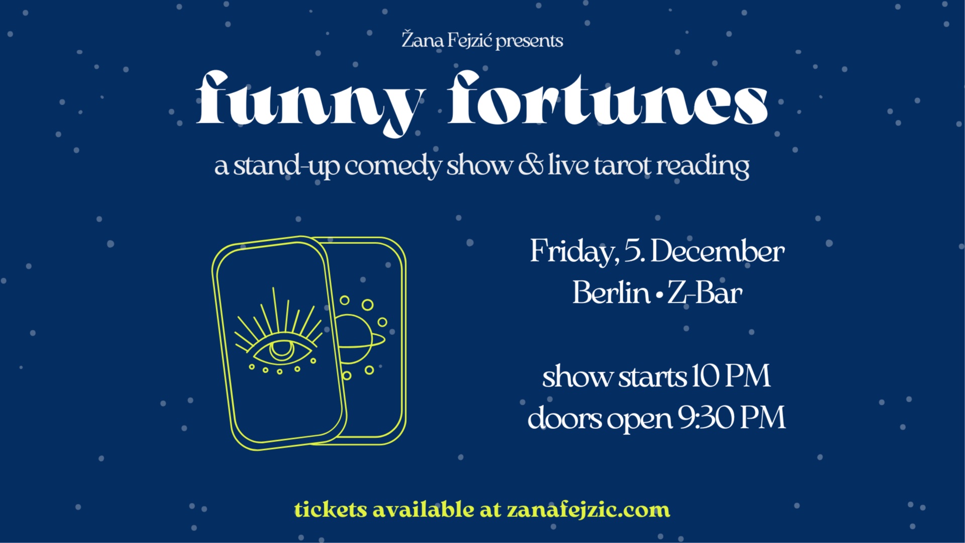 **🎟️ Get your tickets here: [https://fienta.com/funnyfortunesberlindec2025?utm_source=meetup&utm_medium=event](https://fienta.com/funnyfortunesberlindec2025?utm_source=meetup&utm_medium=event)** **Last show of 2025!** **Stand-up comedy meets live tarot reading! Berlin’s 1st & original tarot & comedy show** ✨ In a show that's completely improvised, anything can happen! In this special show, comedian & host Žana Fejzić (BIH/USA) and professional tarot reader Nisrine seek to help you answer life's most difficult questions: Are they ghosting you or are they just lost and hungover in Berghain? 😵💫 Should you quit your start-up job to start DJing? 💽 Will you ever find an apartment with an Anmeldung? 📋 **🔮 HOW TO PARTICIPATE:** When booking your ticket, simply answer "yes" when asked if you'd like to be entered into the raffle for a live tarot reading. The night of the show you'll be given a raffle number. If your number gets chosen, you get to go up on stage for your live tarot reading! **Participation is always optional**: if you change your mind and don't want to go up, we'll simply choose the next number. **🗓️ WHEN:** Friday, 5. December Show begins 22:00 Doors open 21:30 **📍 WHERE:** Z-Bar Bergstrasse 2 10115 Berlin **🎟️ TICKETS:** Starting from €12 when booked online €16 at the door, cash or card (subject to availability) **💁🏼♀️ ABOUT ŽANA (BIH/USA):** Born in Bosnia, raised in Florida, and living in Berlin, Žana’s comedy mirrors her eclectic cultural background and is best described as Balkan pessimism battling delusional American positivity sprinkled in with reggaeton flair. Within 5 months of starting comedy she became a finalist in the 2022 Berlin New Stand Up Awards and is now hosting & producing shows in Berlin & across Europe. **She was nominated for Manchester’s Women in Comedy Festival Awards as Best Newcomer in 2024 and has opened in English & Spanish for a variety of comedians across Europe in such as Dragos Christian, Dwayne Perkins, Rob Anderson, Elena Gabrielle & Silvia de Frente.** You can catch her perform regularly in Berlin to hear her fresh take on the absurdity of immigration laws, her Balkan background, and growing up in Florida. Žana hosts & produces themed & interactive comedy shows in Berlin & beyond, such as the Berlin Comedy Dating Game Show, Funny Fortunes (a comedy & live tarot reading show), Comedy Confessions (an introvert-friendly themed interactive comedy show), Petty Problems (a comedy mock trial show), & more. **She has performed in 36 cities across 16 countries and all of her shows are 100% self-produced. Thanks for supporting an independent artist!** [www.zanafejzic.com](http://www.zanafejzic.com/) [YouTube](http://youtube.com/@ZanaFejzic) [Instagram](http://instagram.com/zanafejzic) [TikTok](http://tiktok.com/@zanafejziccomedy) **💁🏻♀️ FEATURING TAROT READER NISRINE (LBN):** Hailing from a lineage of herbalists and mystics, Nisrine spent her childhood in the valleys of Mount Lebanon conversing with ghosts, and her adult life attempting to evade them. Nearly named "Kawkab Najem" (Planet Star in Arabic) by her grandfather, Nisrine grew up with an inherent sense of seeing beyond the visible and hearing the unspoken, like a self-fulfilling prophecy. Having discovered astrology and tarot during her youth, she plunged into books and seminars, sharpening her grasp of these arts to unlock the secrets of the universe and figure out if her crush likes her back. Today, she resides in Berlin. A corporate girlie by day, bartender by night, and a planet whisperer by twilight, Nisrine uses her unique blend of gifts, tarot, and astrology to guide herself and others towards not ignoring the red flags and maybe living their best lives. **🎟️ Get your tickets here: [https://fienta.com/funnyfortunesberlindec2025?utm_source=meetup&utm_medium=event](https://fienta.com/funnyfortunesberlindec2025?utm_source=meetup&utm_medium=event)**