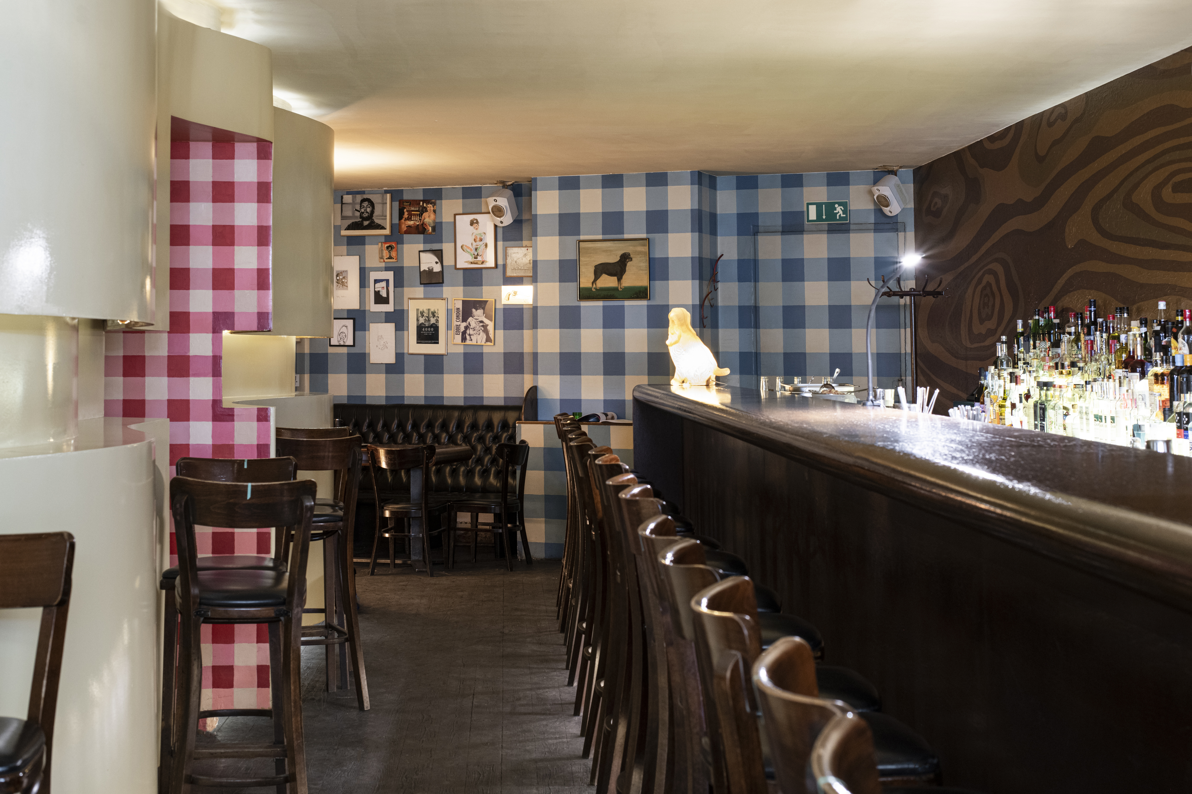 Retro-look cocktail lounge with leather banquette seating, bookshelves & a long, polished wood bar.