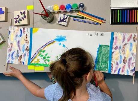 Around the stupa, a traditional Buddhist structure, there are register-like reliefs that tell stories. Roll-outs such as Patuas and Thangkas have a similar narrative structure. Inspired by this, children and adults create their own scroll pictures and leporellos together.