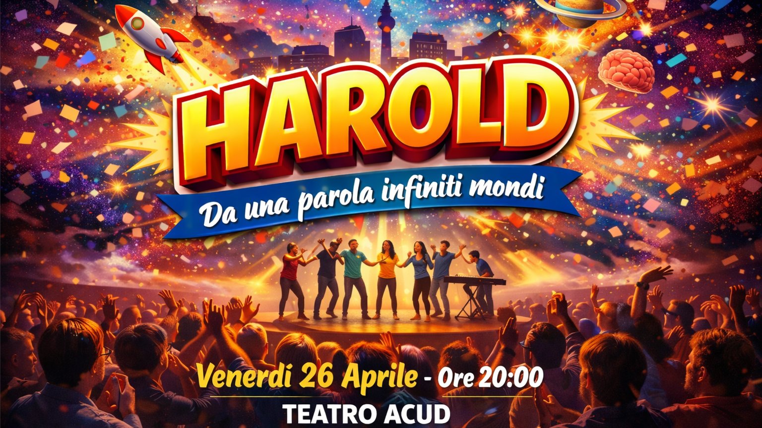 Harold è uno dei formati più iconici dell’improvvisazione teatrale: un mosaico vivo che nasce davanti agli occhi del pubblico. Scene che ritornano, storie che si intrecciano, personaggi che evolvono e si rincorrono in un gioco di richiami, connessioni e scoperte. Non c’è una trama scritta, ma un disegno che emerge poco a poco, tra intuizioni, ritmo e ascolto. Ogni elemento trova il suo posto, ogni dettaglio può diventare fondamentale. È teatro che si costruisce nel momento stesso in cui accade. Ed è proprio lì che succede la magia.