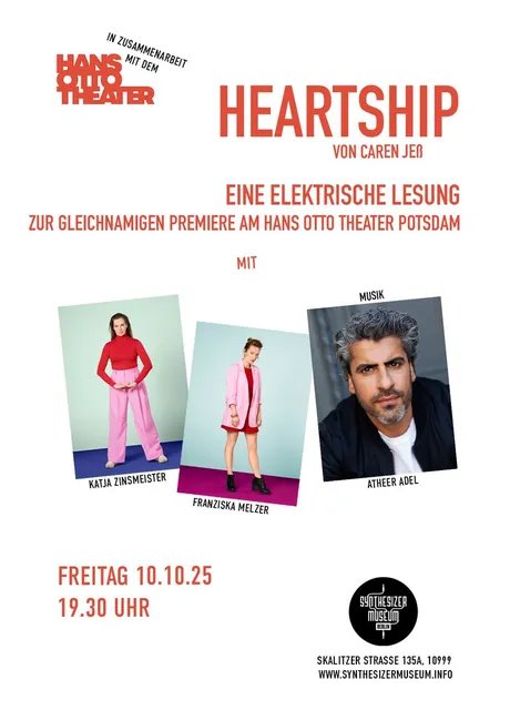 In collaboration with the Hans Otto Theater Potsdam, the Synthesizer Museum is presenting a reading of the play “Heartship” by Caren Jeß, musically accompanied on the Synthesizer by Atheer Adel, ahead of the premiere. With Franziska Melzer, Katja Zinsmeister, and Atheer Adel, directed by Lilli-Hannah Hoepner and Bettina Jantzen.