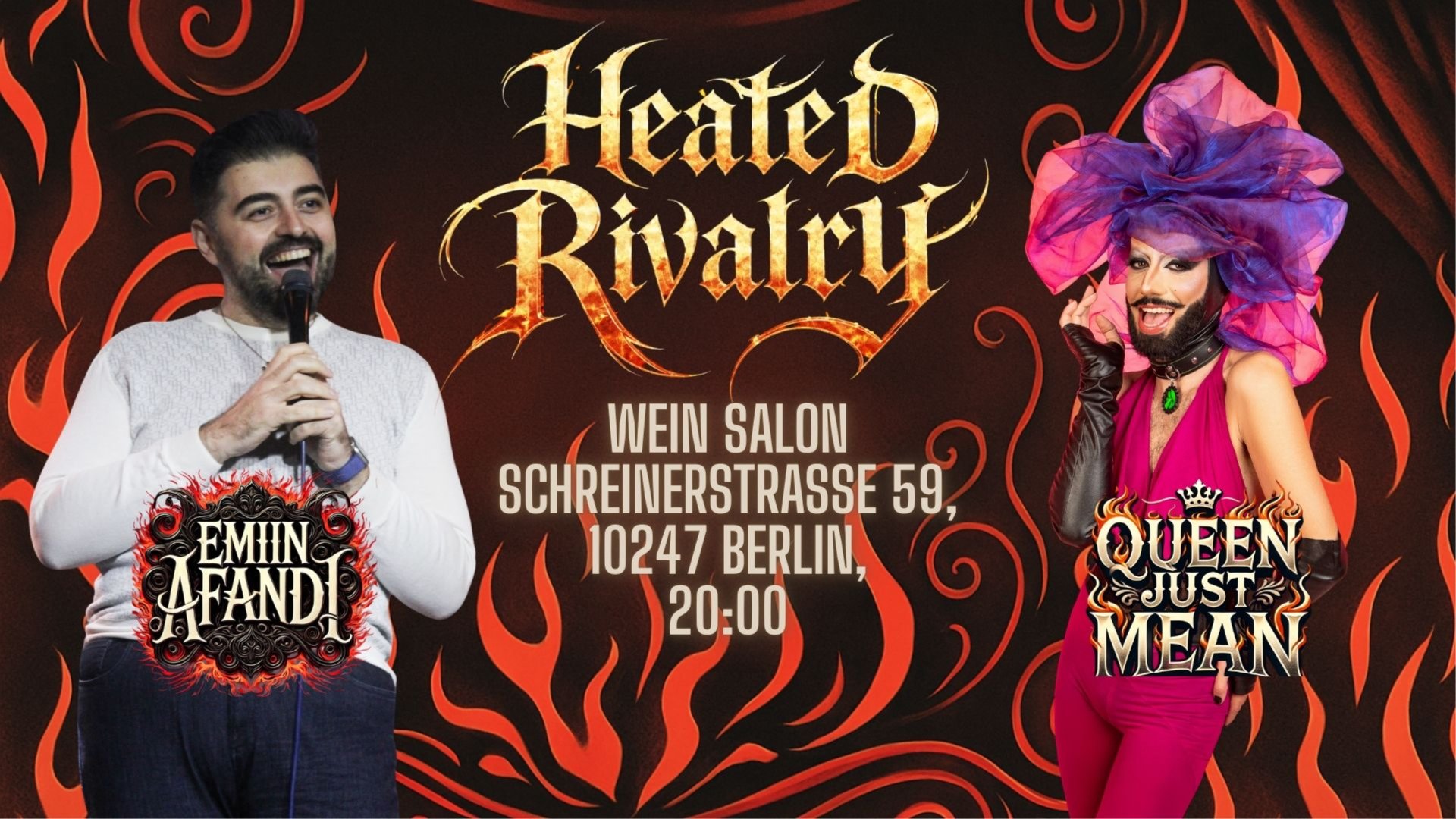 A comedy cabaret where nothing is off-limits—and everything is extra: extra funny, extra fabulous, extra hairy. ### Heated Rivalry: Episode 1 – *Landlord Trouble* **Date:** Thursday, March 5, 2025 **Time:** Doors 18:30 \| Show 20:00 **Location:** Wein Salon Berlin **A rent crisis. Two chaotic flatmates. One stage to save it all.** Join us for the debut episode of Heated Rivalry a brand-new comedy showcase where **stand-up, sketch, drag performances, and lip-sync battles** come together in one blazing night of laughter and fabulous chaos. **THE STORY:** Meet Emin and Queen Justmean — two Berlin-based queer South Caucasian artists and reluctant roommates. In *Episode 1: Landlord Trouble*, rent is due and the money is *not* there. The solution? Perform their hearts out in a desperate, hilarious attempt to pay off their landlord… and maybe win over the audience while they’re at it. **What to expect:** – Fierce **drag performances** – Sharp & witty **stand-up comedy** – Wild **lip-sync battles** – An unfolding **episodic storyline** of flatmate chaos – A celebration of queer art, identity, and South Caucasian voices **Starring:** * **Queen Justmean** – Bearded Berlin drag queen redefining gender norms with humor & glam * **Emin Afandi** – Azerbaijani stand-up comedian & creator of the *WorldVision Comedy Contest*, a sold-out international show touring Berlin and Prague Both performers are proud members of **Teehaus Drag Collective**, dedicated to amplifying queer voices from the South Caucasus region.