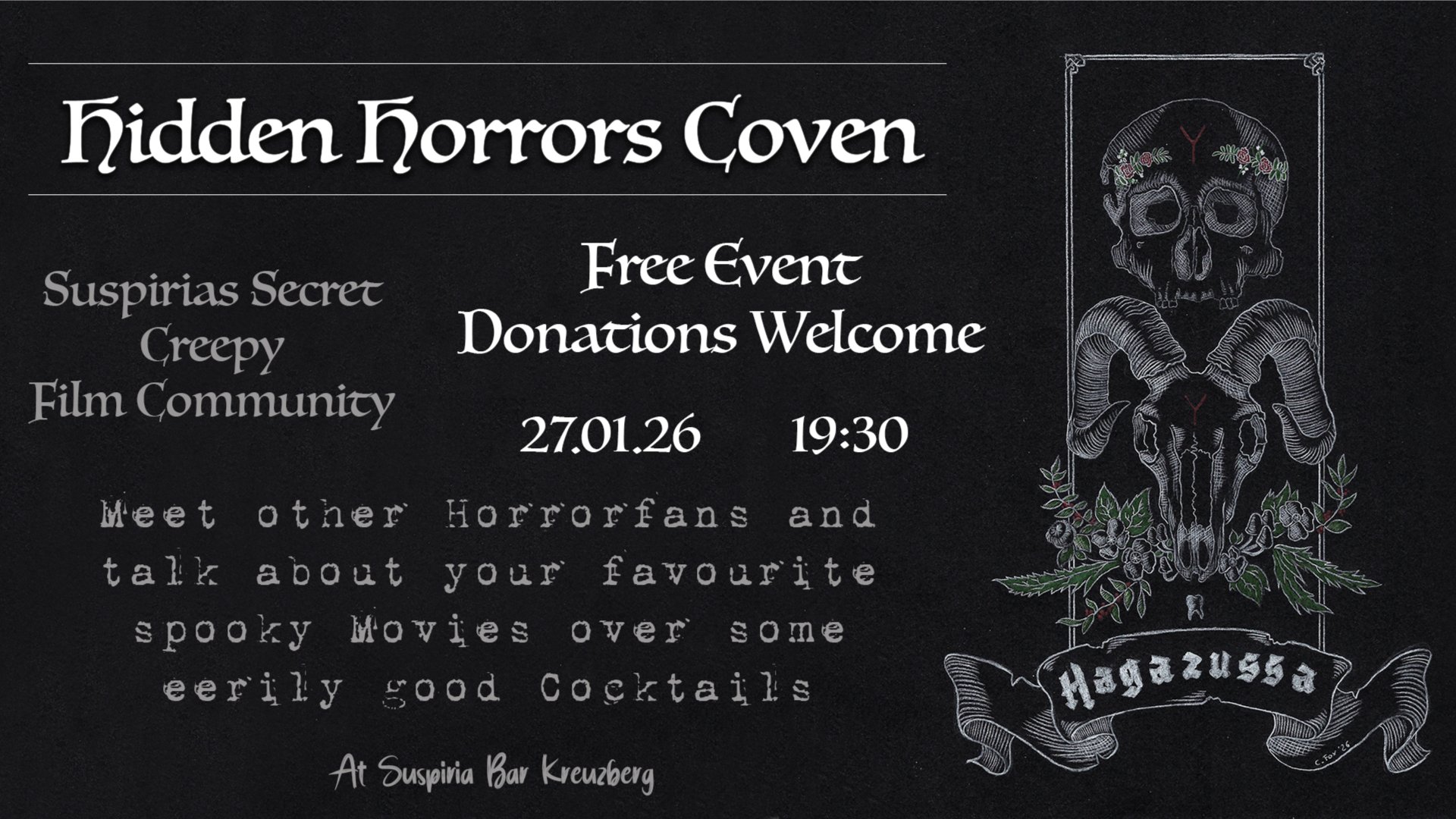 🫀Hagazussa- A Heathens Curse🫀 Are you brave enough to face the curse of the witch? Once more this month, "Hidden Horrors Coven" - Suspirias Secret Horror Society invites all of you fearless souls on a journey. This time we are heading towards the alps to learn the tale of a woman who is accused to be a witch in league with the devil. On the 27th of January our coven will discuss this matter over some witchy cocktails and find out if there is truth in: „Hagazussa - A Heathen’s Curse“ by Lukas Feigelfeld 2018 If you have never heard about this German/Austrian slow burning Folkhorror Movie; let’s change that! Find yourself on a time travel back to medieval times. @suspiria_bar_Kreuzberg @hidden.horrors.coven 👹27. 1.2026 👹Bergmannstr. 104, 10961 Berlin 👹Doors open: 19:30 👹Witchhunt starts: 20:00 👹Door Password: "Pandemonium" Admission is free, donations are welcome. Drinks and snacks are available for purchase. Bring your spookiest friends 🦇 Don't forget to say the password at the door, so we know you are one of us. The coven awaits you! Stay spooky 🫀
