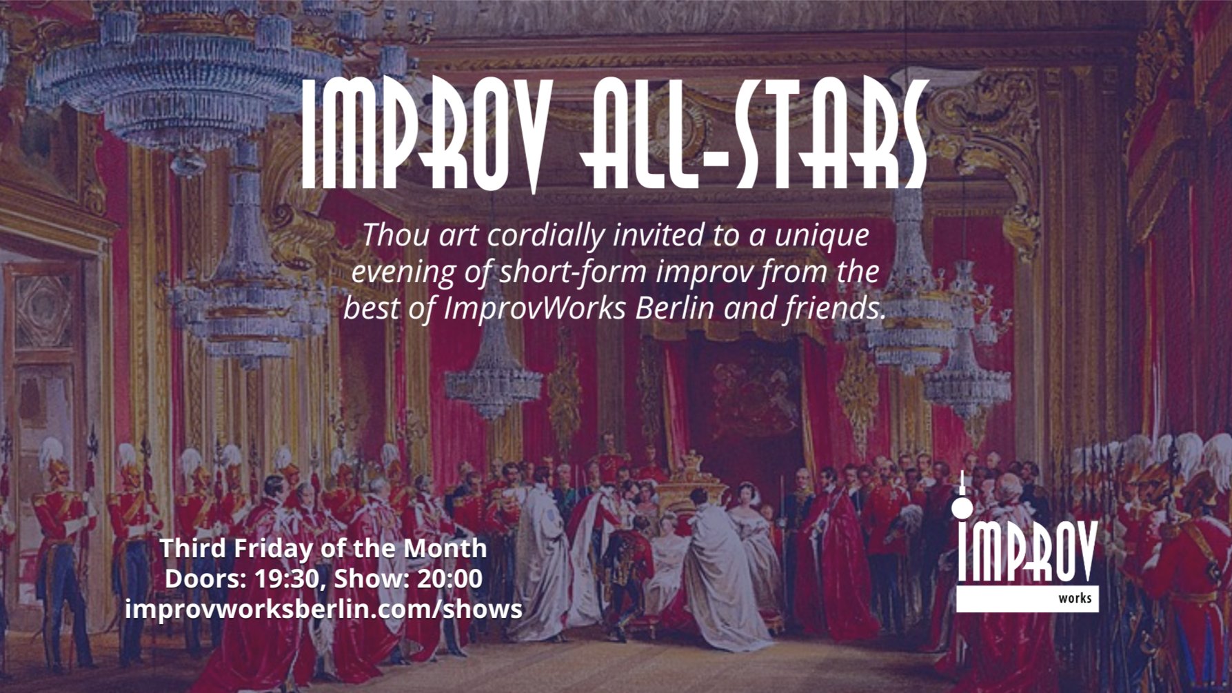 Distinguished guests, thou art cordially invited to a unique evening of short-form improv from the best of ImprovWorks Berlin and friends. Join in the merriment as six of our finest players present "The Buckingham," an exemplary short-form show first developed by Pam Victor of Improv Boston. Over the course of the evening we shall use your suggestions to conjure memorable characters and weave delightful stories to entertain and elucidate even the most erudite audience. Thou shall be amused. Doors: 19:30, Show: 20:00 Limited tickets available, get yours in advance to avoid disappointment: [https://www.improvworksberlin.com/shows](https://www.improvworksberlin.com/shows)