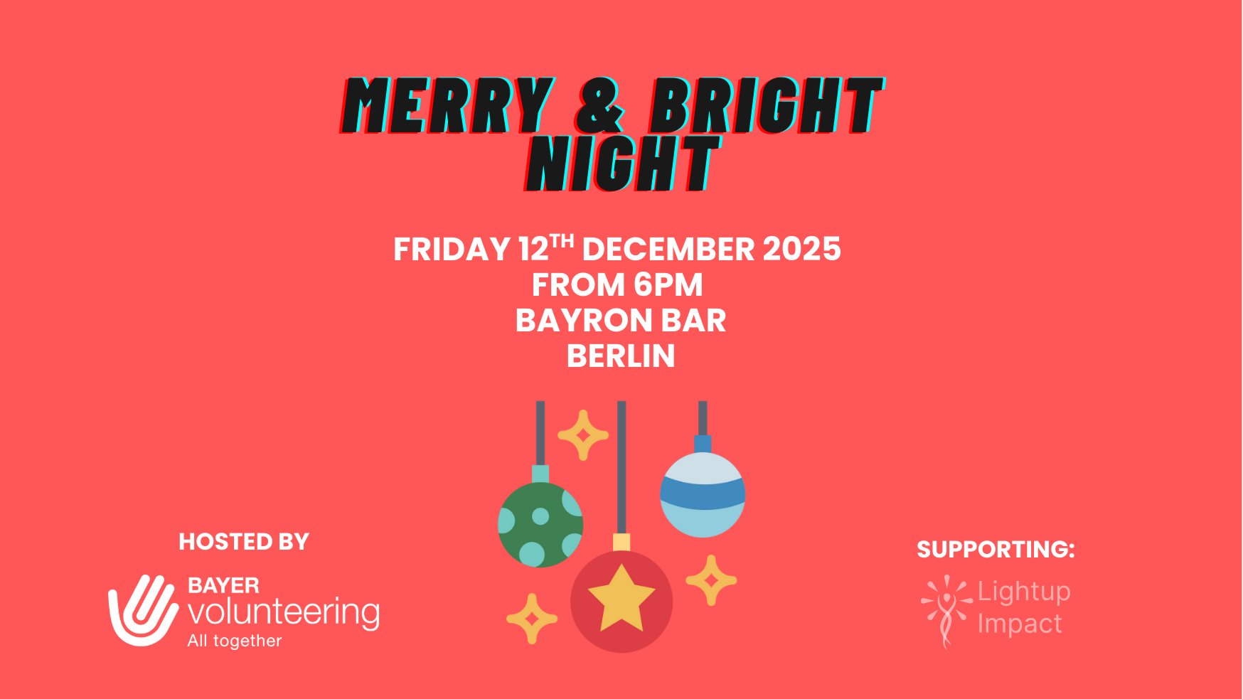 Get ready to light up the night with us as we celebrate the holiday season and raise vital funds for **Lightup Impact**! The Bayer Volunteering Group invites you to an evening of good vibes, music, and community at the Byron Bar in Berlin. 🎶🥂 This event proudly supports Lightup Impact, a dedicated NGO empowering grassroots organizations in East Africa. Your participation directly contributes to their vital work. ❤️🌍 **What to Expect:** * **Live Performance by Revibe & DJ Beats:** Dance the night away! 🎧🎸 * **Delicious Aperitivo & Kenyan Treats:** Savor yummy bites! 🥂🇰🇪 * **Vibrant Auction:** Bid for a cause! 🎁 * **Dynamic Networking:** Connect with a diverse group of like-minded colleagues and friends from various fields, including science, healthcare, startups, AI and NGOs.🤝 **Event Details:** * **When:** Friday, December 12th, from 6:00 PM ⏰ * **Where:** Byron Bar, Müllerstrasse 178, Berlin 📍 **Entry Donation:** * **€10 Donation Entry Ticket:** All proceeds support Lightup Impact. **Secure your spot and make a difference!** 👉 [Merry Brigth Night with Bayer Volunteering Group | Lightup Impact](https://donorbox.org/events/814409/steps/choose_tickets) We can’t wait to see you there for a night of fun, festivity, and impact! Yours, Bayer Volunteering Group Berlin 🤝