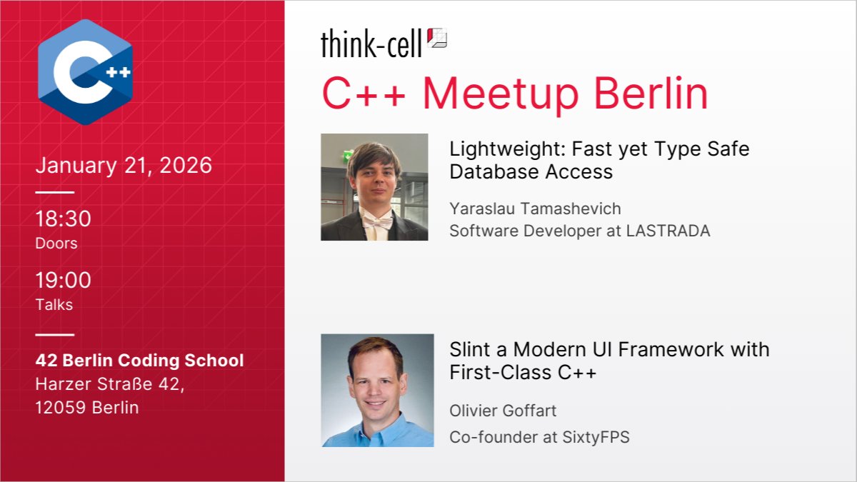 Join us for a C++ meetup, proudly organized by think-cell, on **Wednesday, January 21, 2026**. The event is for C++ engineers eager to learn about "Lightweight: fast yet type safe database access". Connect with fellow engineers and industry experts over pizza and beer in the new year. **Agenda** 18:30 Doors open, snacks & drinks 19:00 Welcome speech by think-cell 19:05 Talks + Q/A 20:15 Pizza and beer, networking 21:30 Farewell **Venue** The meetup will be held at a new location this year. Say hello to [42 Berlin](https://42berlin.de/de/), a vibrant and welcoming space perfect for our gathering. We would like to extend our gratitude to42 Berlin for their generous cooperation in hosting this event. Address: Harzer Str. 42, 12059 Berlin Google Maps: [https://maps.app.goo.gl/tRUZuNqXvCoySysA6](https://maps.app.goo.gl/tRUZuNqXvCoySysA6) **Talk** This talk introduces Lightweight, a new C++ SQL library that aims to provide a user-friendly API while maintaining high performance and type safety. We'll discuss the design philosophy behind Lightweight and the challenges we overcame to create a solution that hides most boilerplate and low-level processes. The presentation will cover the library's iterative development, highlight practical usage examples, and offer an outlook on what's to come, including plans for C++26. **Speaker** **Yaraslau Tamashevich** is a Software Developer at **LASTRADA**, a leading software provider for the construction materials industry. He writes modern C++ code during the day and maintains multiple open-source projects, including a Contour terminal emulator that he attempts not to leave. Before relocation to Berlin, he wrote computational code in Julia to solve nonlinear light–matter interaction problems. He also worked on algorithms for electromagnetic compatibility solutions using C++. **Lightning Talk** *Slint a Modern UI Framework with First-Class C++ Support* by **Olivier Goffart**, **Co-founder at SixtyFPS**. Slint is a modern UI framework for building native applications, with a focus on performance and developer experience. This talk introduces Slint and shows how it can be used through a clean and idiomatic C++ API. We'll also look behind the scenes at how Slint C++ wrapper is made around the Rust implementation, how C++ and Rust interoperate, and how CMake integration is handled so that using Slint from C++ feels natural. **Registration** Seats are limited, so register to secure your spot. We look forward to an evening of technical deep dives and networking with fellow C++ engineers!
