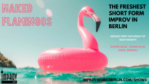 On-the-spot comedy with the Naked Flamingos and The Place Holders Sat May 3rd @ 20:00 – 22:00 €10 Come join Berlin’s freshest, short-form comic improv group at this beautiful space near Warschauer Brücke. The Naked Flamingos, an international flock of Berlin-based improvisors, will perform a series of games and comic scenes in response to suggestions made by YOU, the audience. Think ‘Whose Line Is It Anyway?’ Our invited guests represent the best from Berlin’s standup and improvised comedy scene! Expect music, mayhem and silliness. Don’t expect nakedness or flamingos. Doors open at 7.30pm Show starts at 8pm Tickets using the link or at the door https://www.improvworksberlin.com/shows Follow us @naked_flamingos Venue Zwingli Haus 4th Floor Rudolfstraße 14, 10245 Berlin