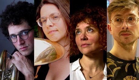Four sound researchers, four horns: Gletsjer^4 forms an ensemble that is both unusual and visionary. Elena Kakaliagou, Morris Kliphuis, Abigail Sanders and Samuel Stoll are internationally active musicians working at the intersection of Neue Musik, improvisation and sound experimentation.