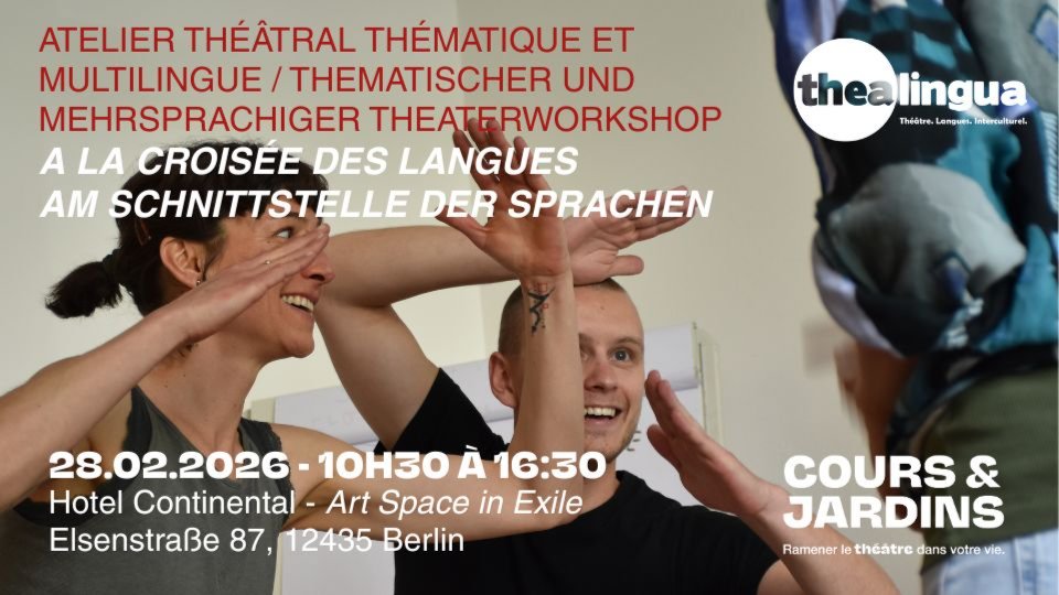 Tauchen Sie ein in einen mehrsprachigen Workshop, in dem Sprachen aufeinandertreffen und auf andere Weise gelernt werden! Ob Sie französischsprachig, deutschsprachig oder einer ganz anderen Sprache angehören, wir laden Sie ein, die Kommunikation jenseits der Worte zu erkunden, wo jede Sprache zählt. Lassen Sie sich mit der Thealingua-Methode vom Spiel, vom Theater und vom Austausch mitreißen, um Selbstvertrauen zu gewinnen und sich zu trauen, die Sprache des anderen zu sprechen! Hotel Continental – Art Space in Exile, Elsenstraße 87, 12435 Berlin Für französisch-, deutsch- oder anderweitigsprachige Erwachsene Moderator: Zineddine Smain \*\*\*\* Immerse yourself in a multilingual workshop where languages meet and are learned in a different way! Whether you speak French, German or a completely different language, we invite you to explore communication beyond words, where every language counts. Let yourself be carried away by the Thealingua method, through play, theatre and exchange, to gain confidence and dare to speak each other's language! Hotel Continental – Art Space in Exile, Elsenstraße 87, 12435 Berlin For French-, German- or other language-speaking adults. Anmeldung/registration https://widgets.yolawo.de/w/0/bookables/688cdd27528bd3f9c65beb27 Contact : *info****[@thealingua.com](mailto:Danae@thealingua.com)***