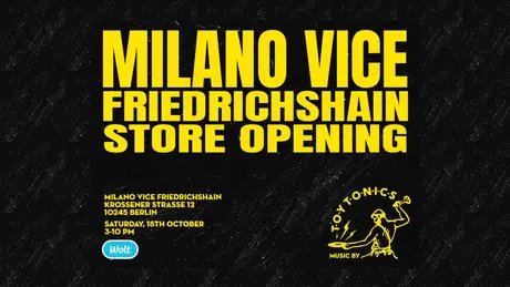 On October 18, Milano Vice celebrates the opening of its second store in Berlin-Friedrichshain – right on Boxhagener Platz (Krossener Str. 12) – together with the trendy label Toy Tonics.