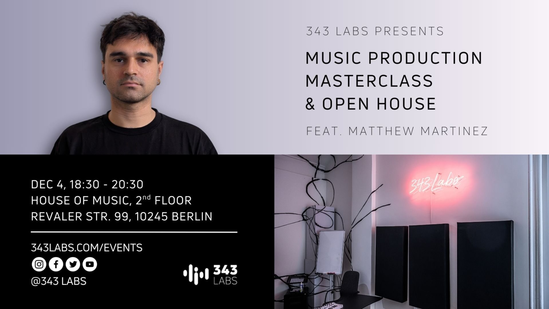 **RSVP on the [343 Labs website](https://343labs.de/events/open-house-masterclass-7/#) to save your seat!** Join us for a free Music Production Masterclass with producer, DJ and 343 Labs instructor Matthew Martinez. During the workshop, Matthew will demonstrate how he approaches making music and navigates the powerful tools of Ableton Live. Learn fundamental as well as advanced music production techniques that will make your music stand out. During the event, 343 Labs will be opening its doors for an Open House, where attendees can tour the facilities, learn about 343 Labs courses, and meet some of the instructors. This is a great way to get a feel for the community and programs at 343 Labs, meet fellow producers, and ask any questions you may have about our school.