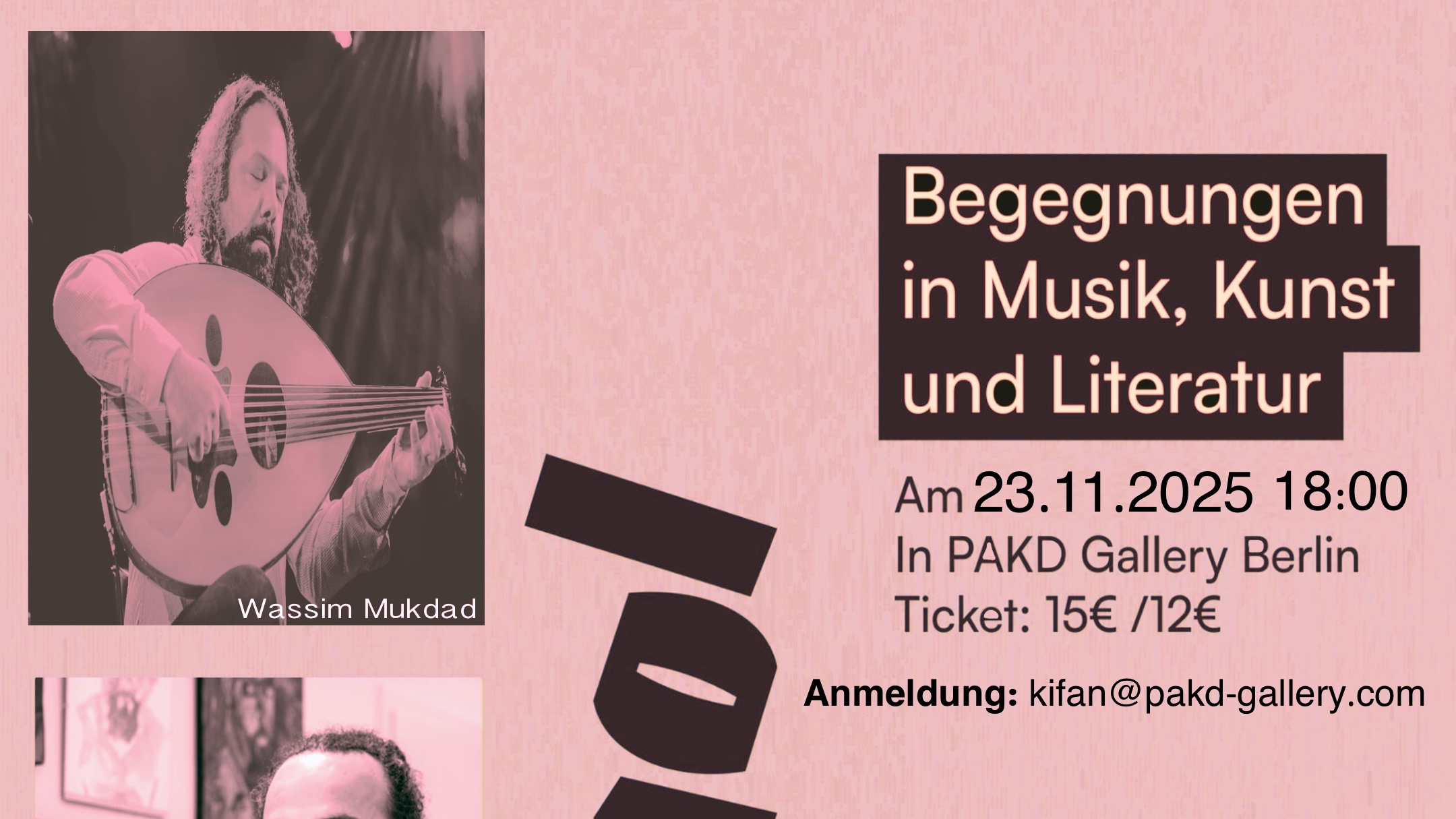 Musik, Kunst und Literatur Mit Wassim Mukdad Live Musik, Kifan Alkarjousli Live Malen und Sandra Reinhart Live Vorlesen 23\.11\.2025 \| 18:00 Uhr Erlebe ein einzigartiges Zusammenspiel von Live-Musik, Live-Malerei und Literatur 🎼 Wassim Mukdad entführt dich mit den faszinierenden Klängen der Oud in eine andere Welt. 🎨 Kifan Alkarjousli lässt sich von der Musik inspirieren und erschafft in Echtzeit ein Kunstwerk. 📖 Sandra Reinhart wird Auszüge aus ihren Texten und Lyrik lesen. Ihre Texte und Gedichte entspringen aus ihrer eigenen Erfahrung, die ihr dieses Leben schenkte und dem was ihr unsere Gesellschaft bis dato zeigte. 📍 Ort: PAKD Gallery, An der Mole 9, 10317 Berlin 🕖 Zeit: 18:00 Uhr 🎟 Tickets: 15 € \| Ermäßigt: 12 € Plätze sind begrenzt – sichere dir dein Ticket jetzt! Anmeldung: kifan@pakd-gallery.com