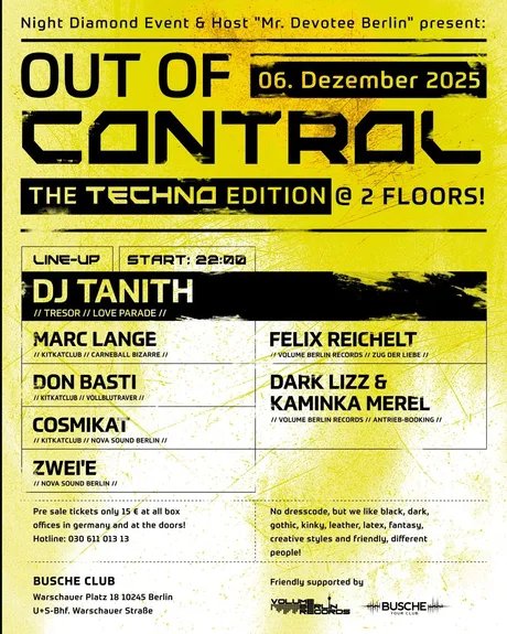 A truly special event highlight awaits you at Busche Club: legendary DJ TANITH will be on the decks alongside Marc Lange, Don Basti, Cosmikat (known from KitKatClub), Felix Reichelt, Dark Lizz, Kaminka Merel and Zwei'E – on two floors full of energy and driving beats.