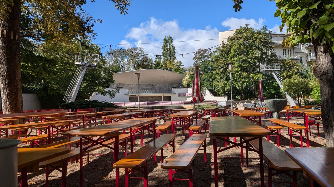 Seasonal, self-service beer garden with 600 seats under chestnut trees, for locally brewed beers.