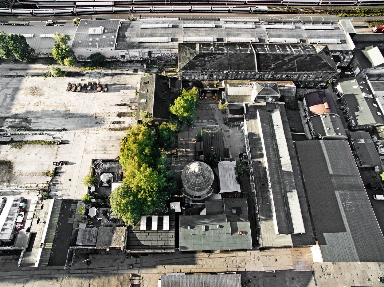 Trackside cluster of nightclubs, snack bars & business spaces in repurposed industrial buildings.