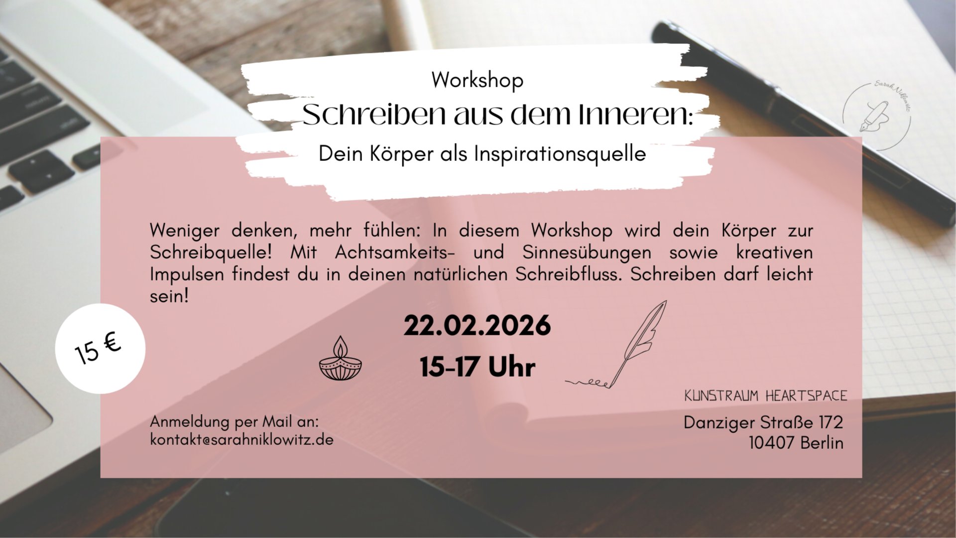 Endet dein Schreiben auch oft, obwohl du noch gar nicht angefangen hast? Bevor die ersten Zeilen überhaupt auf den Tasten oder dem Papier landen, werden sie schon im Kopf zensiert und am Ende gar nicht geschrieben. Weil man es immer gleich perfekt machen will, das Geschriebene von Anfang an „gut“ sein und die Idee schon ausgereift sein muss. Wer kennt’s? Kein Wunder, dass uns das blockiert! Damit unser Schreiben wieder leicht wird, habe ich einen Workshop erstellt, mit dem wir wieder lernen, uns zu vertrauen. Lass deinen Körper seine Arbeit machen und gönne deinem Kopf mal eine Pause. Der Schreibfluss darf sich leicht anfühlen – und das Ergebnis trotzdem (oder gerade deshalb) gut werden. Unser Körper hat uns so viel zu erzählen. Wenn wir uns den Raum geben, mal wirklich hineinzufühlen, kann er ganze Geschichten erzählen. Wir müssen ihm nur zuhören. \-\-\- Does your writing often end before you've even started? Before the first lines even hit the keyboard or paper, they're already being censored in your head and end up not being written at all. Because you always want to get it perfect right away, you want what you write to be “good” from the start and the idea to be fully developed. Who hasn't been there? To make writing easy again, I have created a workshop that teaches us to trust ourselves again. Let your body do its work and give your head a break. The flow of writing should feel easy—and the result will still be good (or because of it). Our bodies have so much to tell us. If we give ourselves the space to really listen, they can tell whole stories. We just have to look closely.