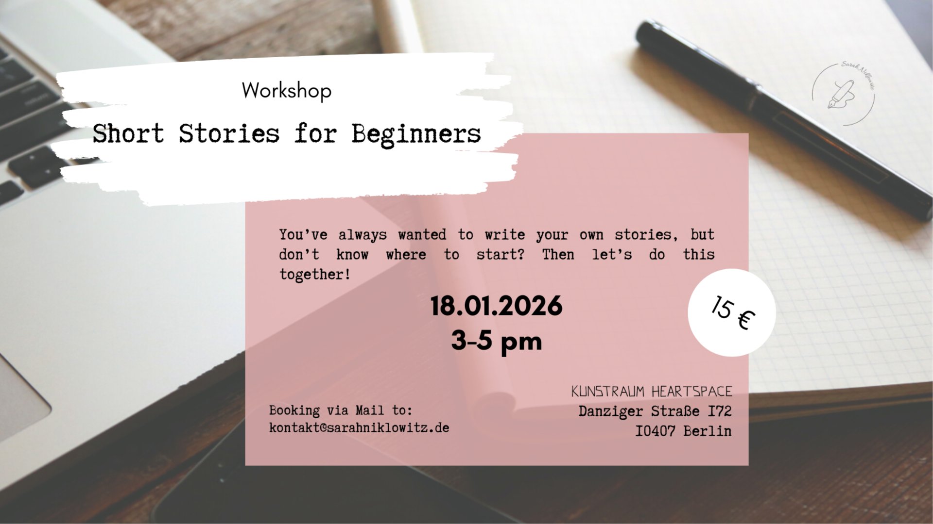 *(EN)* **Writing can be easy and fun!** Do you want to write but don't know where to start? Do you want to get back into it, but the blank page intimidates you? Are you still hesitant to write your own stories? Then this workshop is perfect for you. We'll meet in a cozy, safe space with plenty of room to experiment, write, and share ideas. Completely free of performance pressure or the pressure to be productive. Instead, you'll find plenty of inspiration, valuable tips, and above all, the joy of writing. Sarah Niklowitz will show you simple yet effective methods that gently nudge you into the world of writing and provide you with writing prompts. We'll release everyday stress with a simple breathing meditation and short mindfulness exercises, giving ourselves permission to be creative. All you need is yourself and your laptop or pen and paper. If you like to write with music in your ears, feel free to bring headphones – Sarah has prepared a playlist for you! Sarah Niklowitz will show you simple yet effective methods that will gently nudge you into writing and provide you with writing prompts. The workshop will be hosted in English, but you are of course welcome to write in any language you feel comfortable with. **Register directly with Sarah [here](https://sarahniklowitz.de/short-stories-workshop/).** *(DE)* **Schreiben darf leicht sein und Spaß machen!** Du hast Lust zu schreiben, aber weißt nicht, wo du anfangen sollst? Du willst wieder einsteigen, aber das leere Blatt Papier macht dir Angst? Du traust dich noch nicht so ganz an deine eigenen Geschichten? Dann ist dieser Workshop genau für dich. Wir treffen uns in einem gemütlichen Safe Space mit viel Raum zum Ausprobieren, Schreiben und Austauschen. Ganz ohne Leistungsdruck oder Produktivitätszwang. Dafür mit viel Inspiration, wertvollen Tipps und vor allem Spaß am Schreiben. Sarah Niklowitz zeigt Dir ganz einfache, aber wirkungsvolle Methoden, die Dich sanft ins Schreiben schubsen und versorgt Dich mit Schreibimpulsen. Wir lösen uns mit einer einfachen Atem-Meditation und kleinen Achtsamkeitsübungen vom Alltagsstress und geben uns damit selbst die Erlaubnis, kreativ zu werden. Du brauchst nur Dich selbst sowie Dein Laptop oder Stift & Papier. Wenn Du gerne mit Musik im Ohr schreibst, bring gerne Kopfhörer mit – Sarah hat eine Playlist für Dich vorbereitet! Der Workshop wird auf Englisch gehostet, Du bist aber natürlich herzlich dazu eingeladen, in jeder Sprache zu schreiben, mit der Du Dich wohlfühlst. **Melde Dich direkt [hier](https://sarahniklowitz.de/short-stories-workshop/) bei Sarah an.**