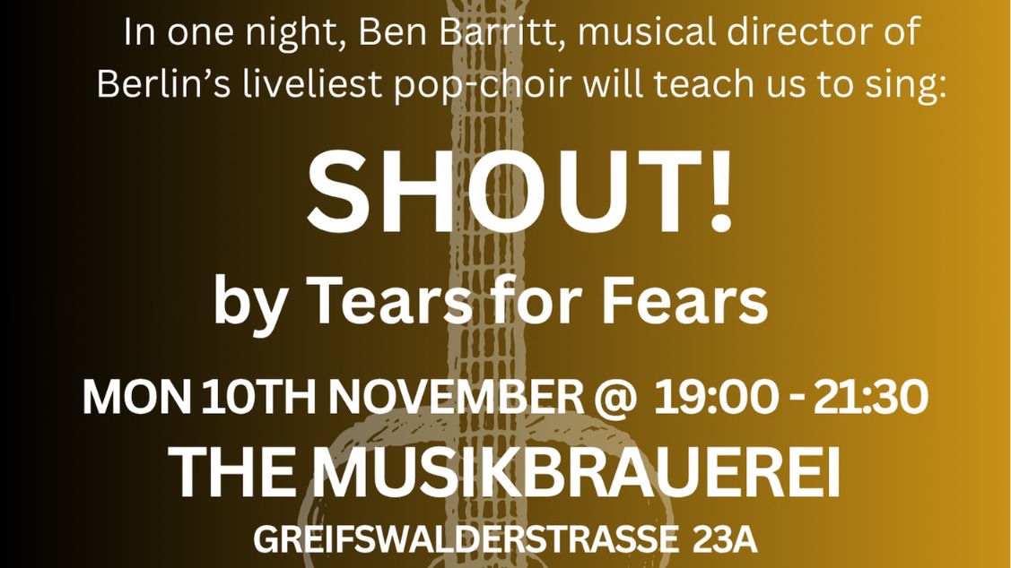 Join the Berlin international community for another Sing Social at the mesmerising Musikbrauerei, located in the heart of Prenzlauer Berg. All adults welcome! (Note, not for children under 16). In just two hours, professional musical director Ben Barritt (UK) and his guitar will teach us ‘Shout’ by Tears for Fears. It's a great opportunity to mix & mingle with like-minded people in an intimate yet unique setting of the Musikbrauerei. Date: Monday 10th November, 19:00 - 21:30. Where: Musikbrauerei, Greifswalderstr 23A, 10405, Berlin. Tickets just 12.50€ + €0.70 transaction fee, can be bought here: https://buytickets.at/singsocial/1911431 100% good vibes guaranteed.