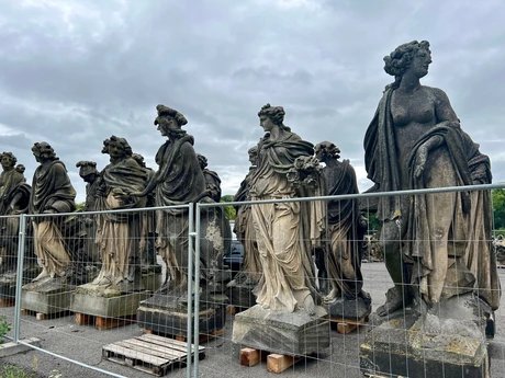 To renovate the roof of the New Palace, 98 sandstone parapet sculptures have to be dismantled. This is a unique moment when the sculptures, which are up to 3.70 m high and weigh 3.5 to 4 tons, can be inspected up close.