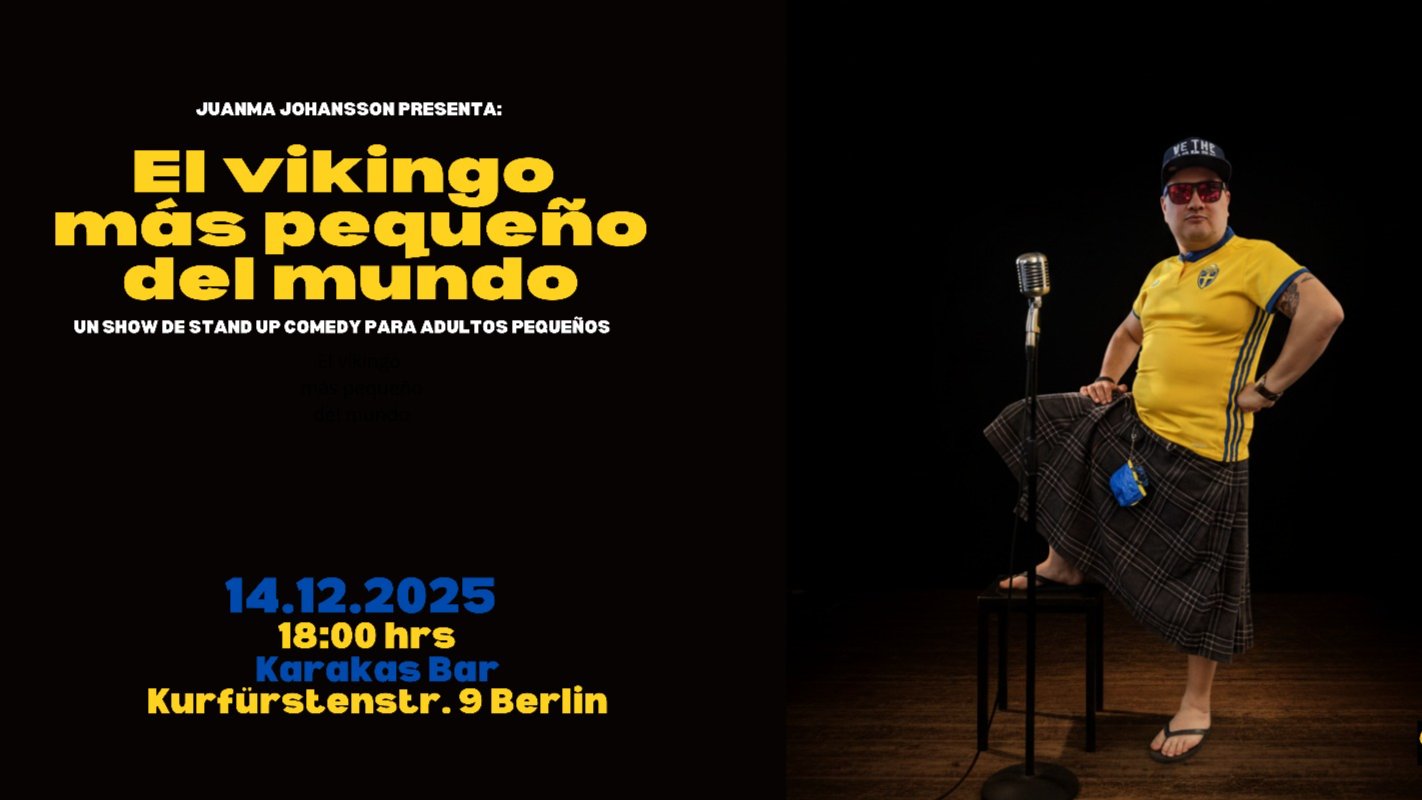 ¡Ven a conocer a Juanma Johansson, el vikingo más pequeño del mundo en persona y descubre su increíble historia! PREVENTA: https://juanmavikingo-14dic25.eventbrite.co.uk/?aff=meetup STANDUP en español 💥 JUANMA JOHANSSON – EL VIKINGO MÁS PEQUEÑO DEL MUNDO Última función del show: "El Vikingo Más Pequeño del Mundo" 💥 Prepárate para una noche de humor incómodo y brutalmente honesto —de ese que te hace reír aunque por dentro escuches la vocecita que dice “esto no está bien”. Si te gusta el humor políticamente incorrecto, irreverente, cruzando límites pero con inteligencia… este es tu tipo de comedia. Si no, pues ven igual, así te ríes en secreto. Juanma Johansson es uno de los talentos hispanohablantes más destacados y activos de la escena de comedia en Berlín, conocido por su estilo directo, su mezcla cultural improbable (medio latino, medio vikingo, 100% confundido) y su capacidad para convertir trauma, migración y crisis existencial en carcajadas. Ha abierto shows para varias figuras importantes de la comedia en español y alemán, incluyendo Franco Escamilla, La Cotorrisa, Alex Fernández, El Profesor Briceño, Paul "el Alemán", Los Resolvedores y Se Me Subió el Muerto. Después de estrenar su primer especial en 2024, realizar gira por Europa y regresar triunfalmente de Guatemala (donde vendió como estrella internacional… aunque para la familia sigue siendo “el que no terminó la carrera”) cierra oficialmente este show para siempre. Sí, esta es la última oportunidad de ver a “El Vikingo Más Pequeño del Mundo” antes de que desaparezca como sus metas de Año Nuevo. Ven si te gusta reírte de lo que no deberíamos.